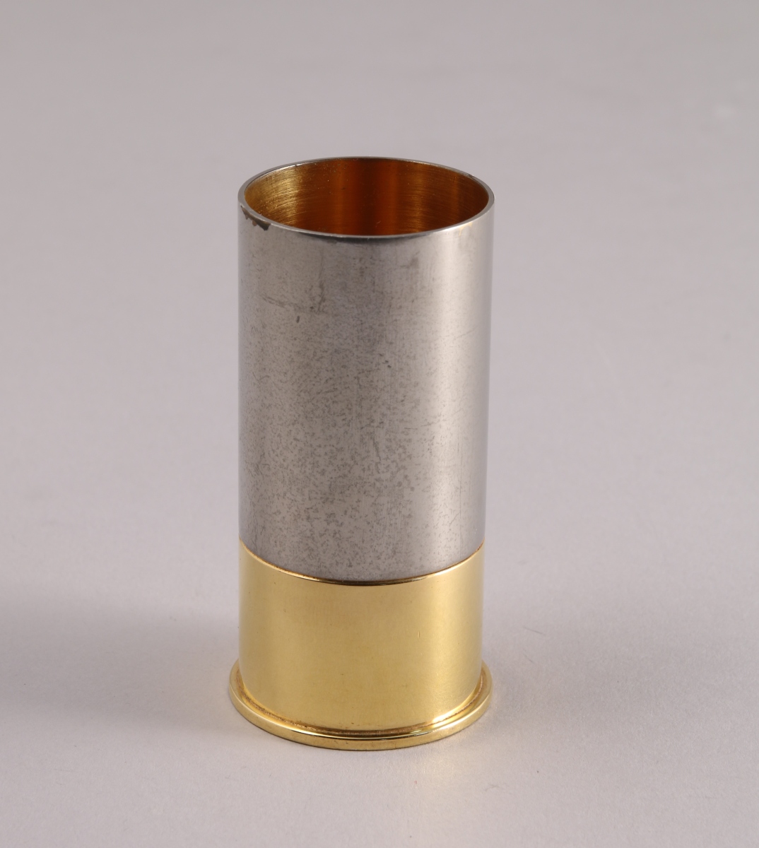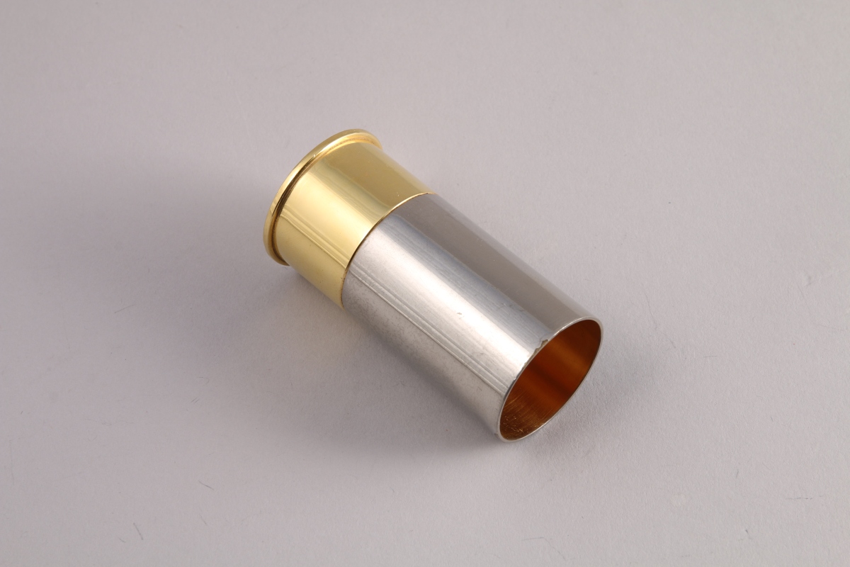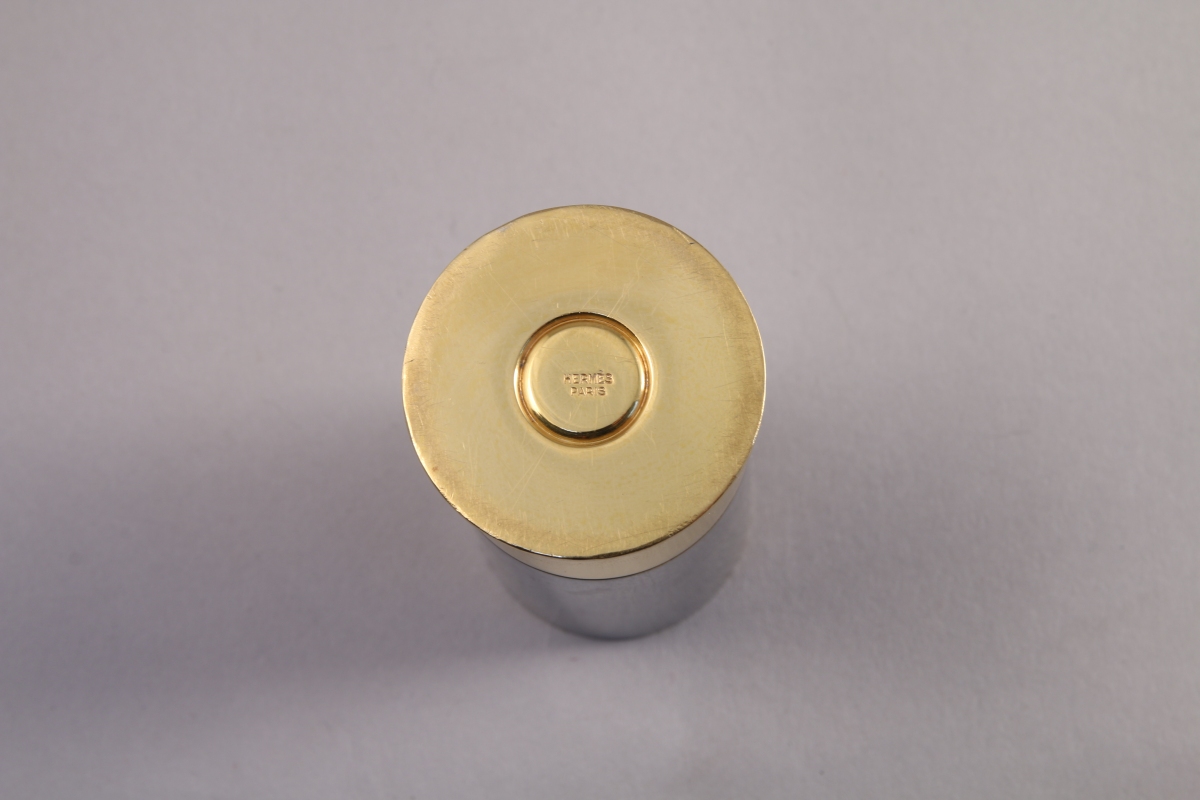 HERMÈS. PORTE-ALLUMETTES adoptant la forme d'une cartouche de chasse en métal doré et argenté. Signé.