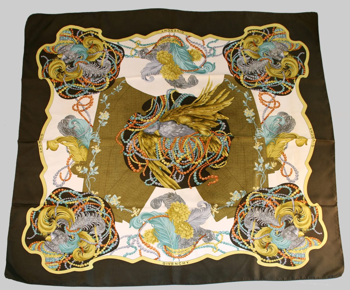 - GIVENCHY. CARRÉ en soie imprimée à décor d'oiseaux et perles.