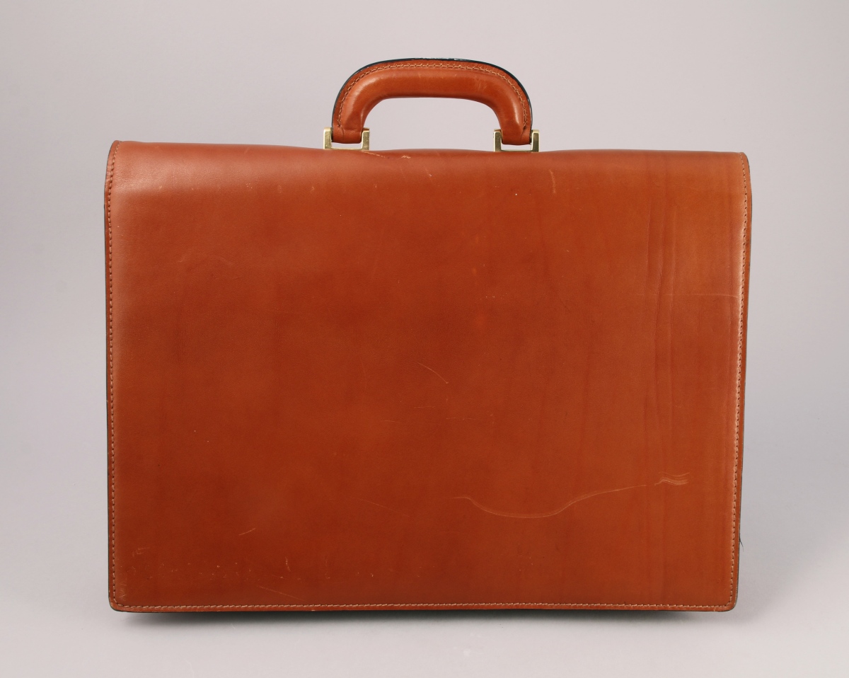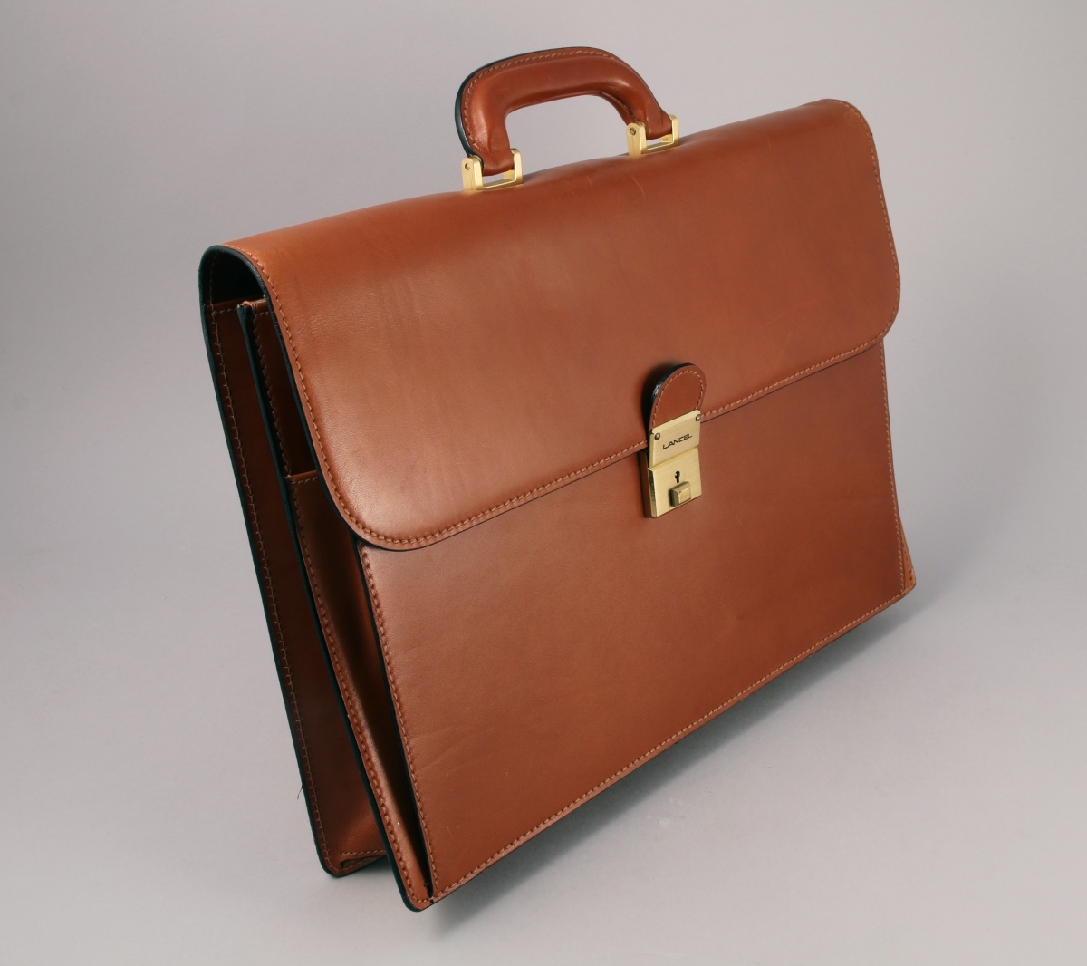 LANCEL. SERVIETTE à un soufflet en cuir fauve. Fermoir en métal doré. Intérieur à compartiments moiré. État proche du neuf.