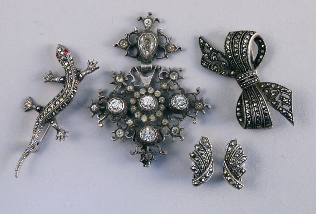 - une BROCHE PLAQUE articulée ornée de faux diamants,