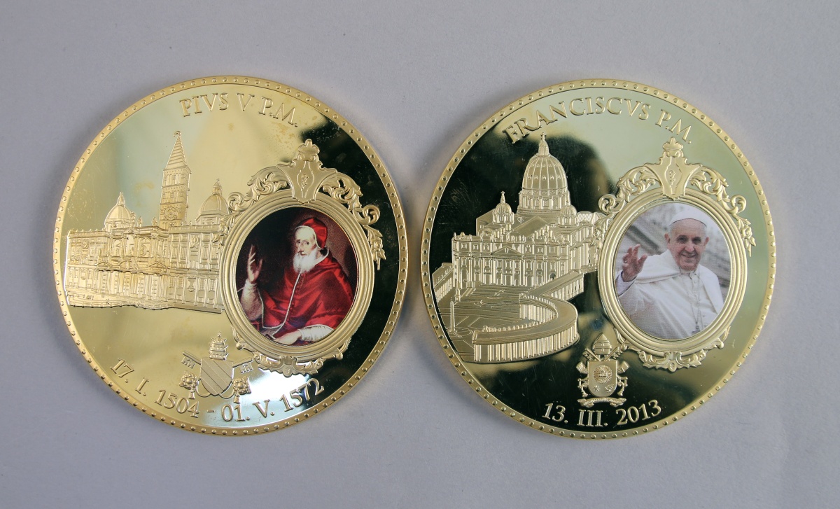 PAIRE de MÉDAILLES en métal doré. L'avers figure, pour l'une, le portrait du pape saint Pie V (lithographie) et la basilique Sainte-Marie-Majeure, et pour l'autre, le portrait du pape François et la basilique Saint-Pierre. Le revers titré "CIVITAS VATICANA" présente le Christ en croix flanqué des armes des papes François, Innocent XI, Grégoire XIII et saint Pie V.