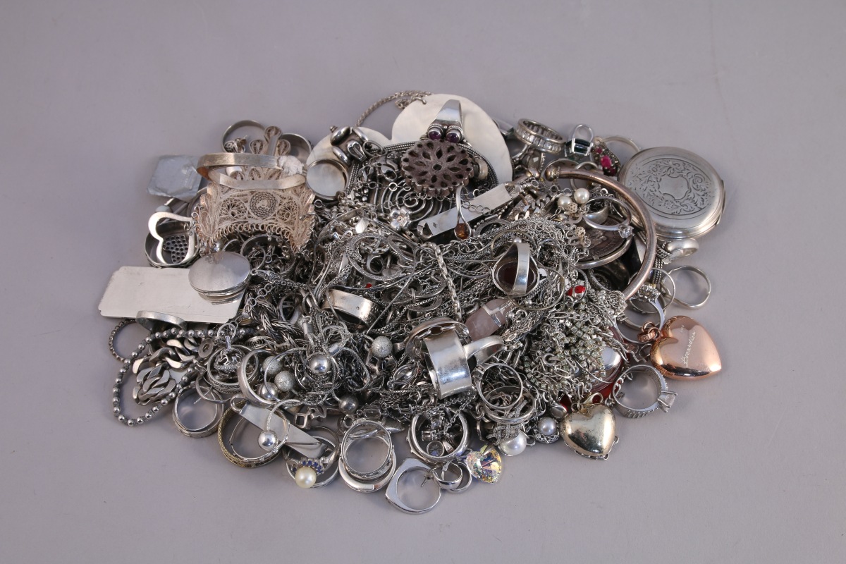 RÉUNION de BIJOUX en argent dont : couronne à décor filigrané, pendentifs, bagues, chaînes, bracelets, collier retenant une pièce de 5 francs, lingot chinois, montre de gousset...