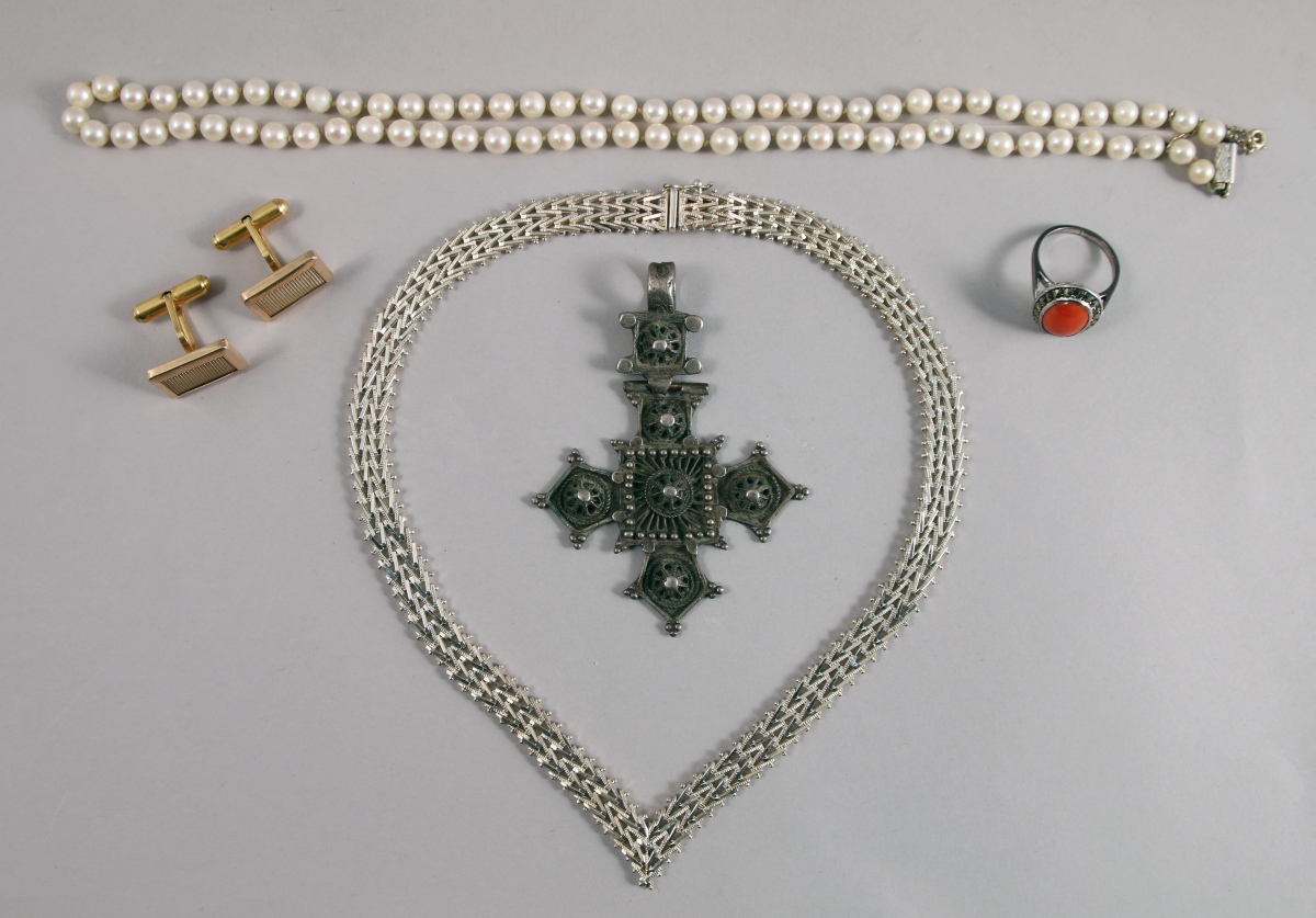 Un COLLIER de PERLES, un COLLIER en argent mexicain, une CROIX en ARGENT travail ancien, une BAGUE en argent orné d'une pierre dure et une Paire de BOUTONS de MANCHETTE en métal doré.