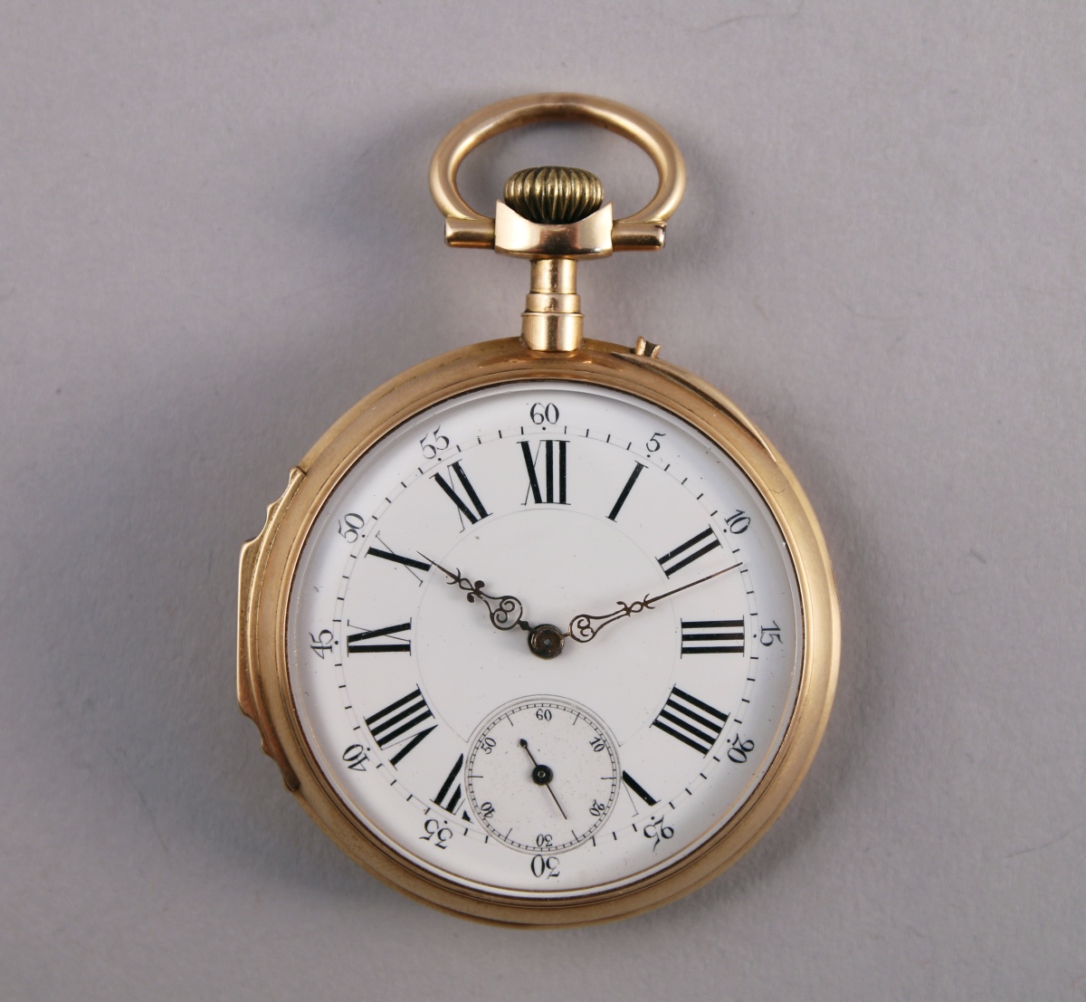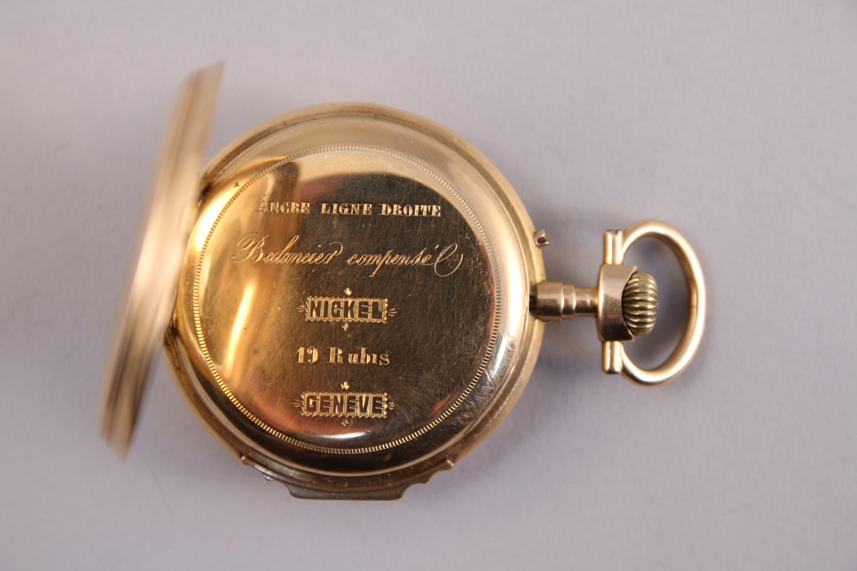 Belle MONTRE de GOUSSET en or jaune 18K, à double cadrans émaillés, le petit gradué à 6 heures avec la trotteuse des secondes , le grand gradué pour les minutes, les heures en chiffres romains et chaque période de 5 minutes en chiffres arabes. Remontoir à 6 heures. La cuvette monogrammée EO (?). Cache poussière en or gravé "Ancre ligne droite / Balancier compensé / Nickel / 19 rubis / Genêve".
