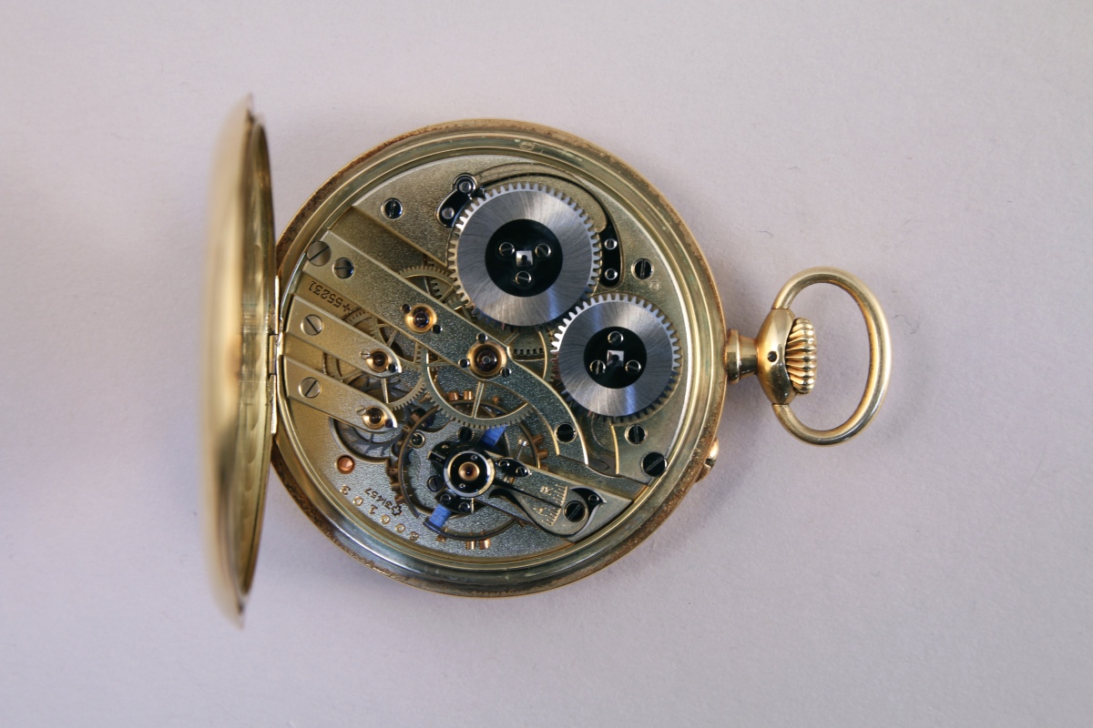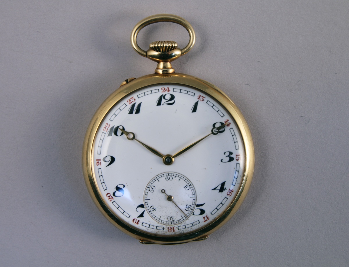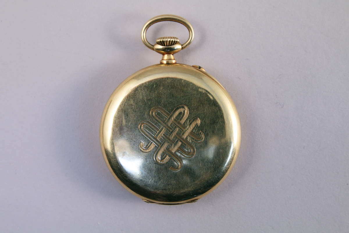 MONTRE de GOUSSET en or jaune à remontoir au pendant. Double cadran émaillé blanc indiquant les heures en chiffres romains et les minutes et secondes en chiffres arabes. Le dos du boîtier monogrammé "MN".