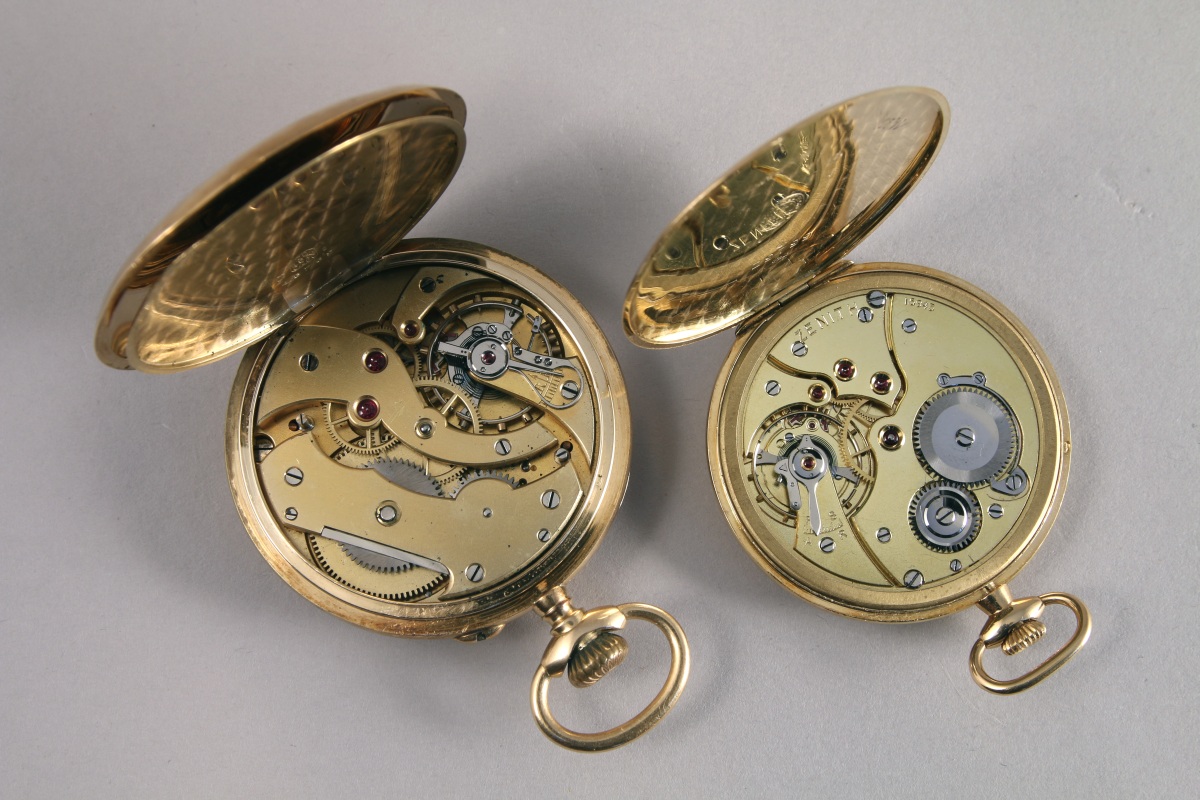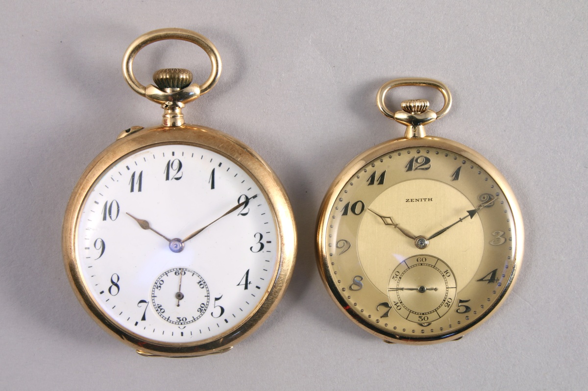 DEUX MONTRES de GOUSSET en or jaune 18K, à remontoir au pendant. Double cadran émaillé blanc pour l'une et à fond doré pour celle de la maison ZÉNITH.