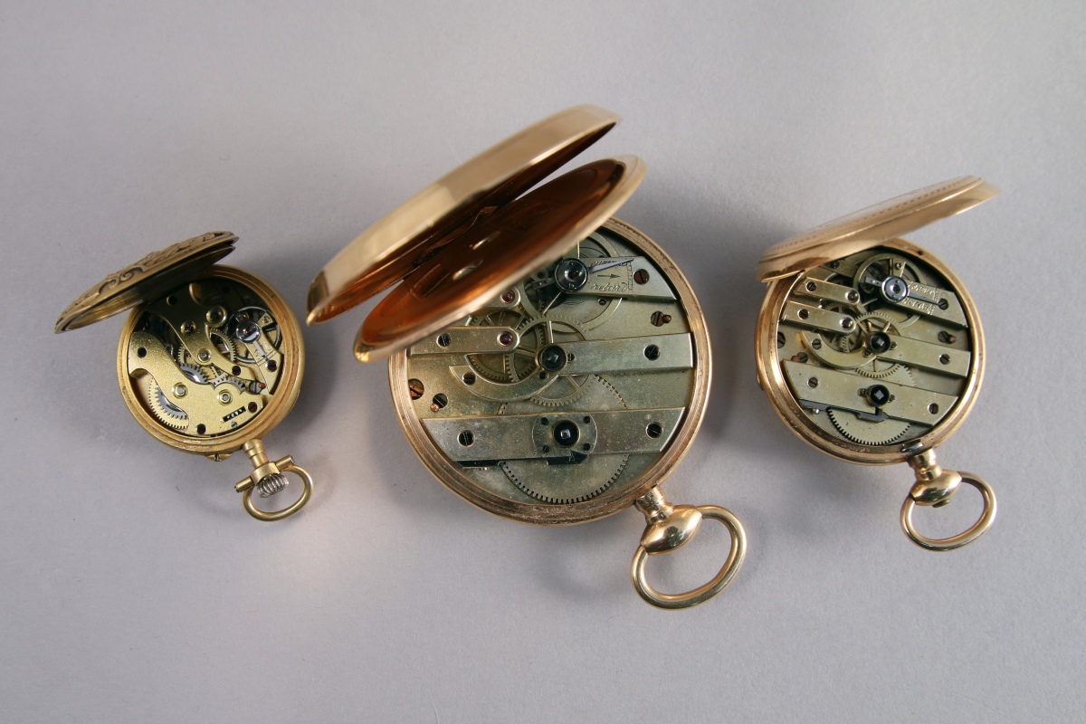 RÉUNION de TROIS MONTRES DE GOUSSET en or jaune : une d'homme à clef et deux de dame, l'une à clef, l'autre à remontoir au pendant.