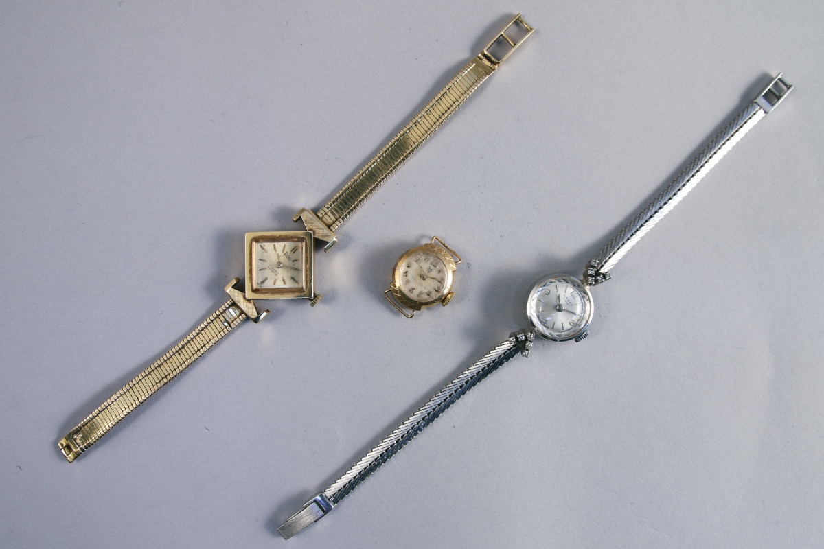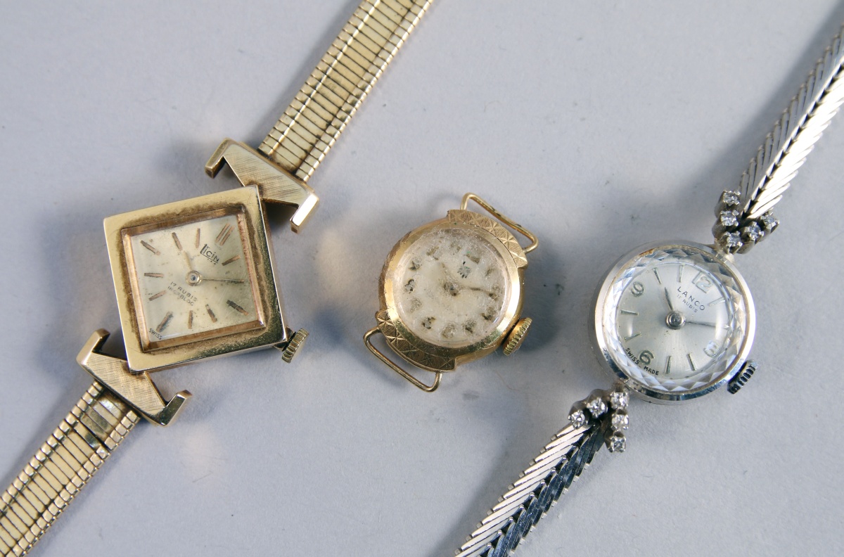 - La première en or blanc. Cadran de forme ronde épaulé de 10 petites pierres blanches signé LANCO. Poids brut : 22,9 g.