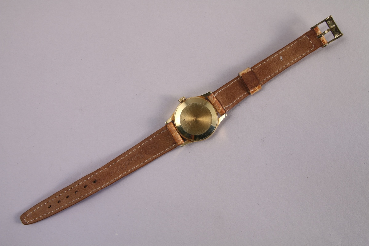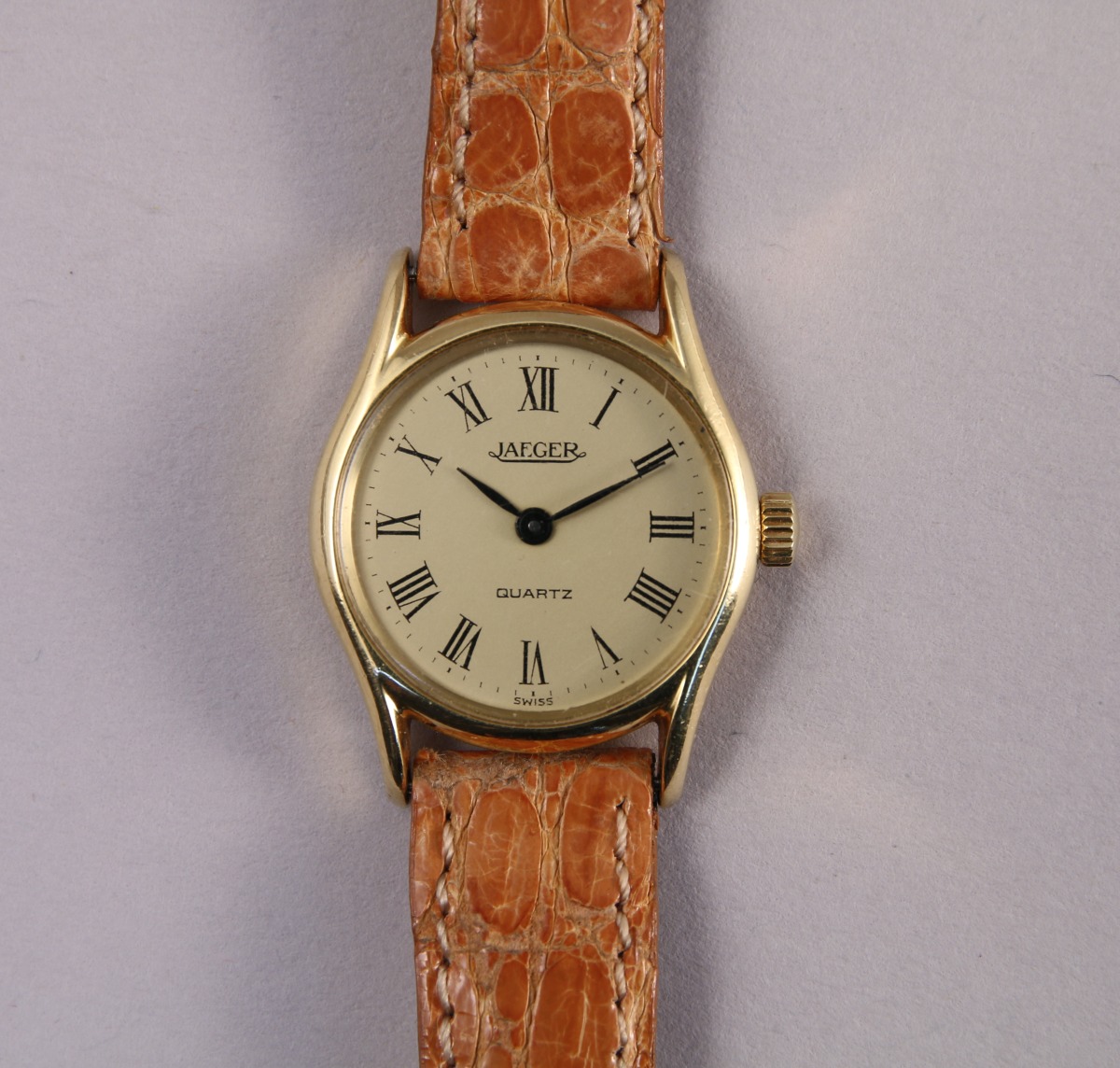 JAEGER-LECOULTRE, MONTRE-BRACELET de DAME en or jaune 18K, le boitier de forme ronde, cadran doré, chiffres romains pour les heures, bracelet en cuir. Mouvement à quartz. Écrin.