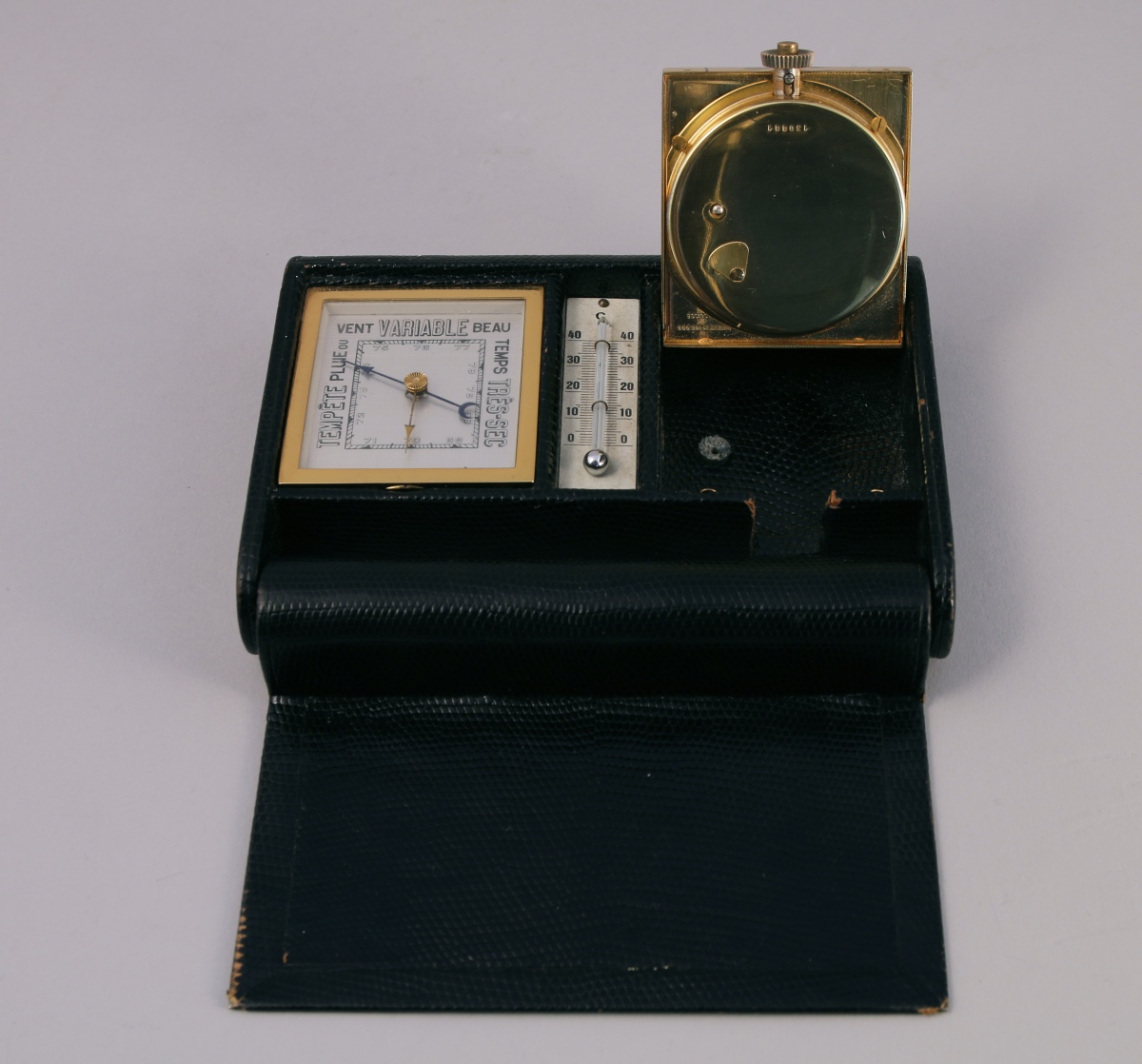 RÉVEIL / BAROMÈTRE / THERMOMÈTRE de VOYAGE en métal doré. Dans un étui gainé de lézard noir. La pendulette à aiguilles luminescentes à index bâtonnets est numérotée 130441.
