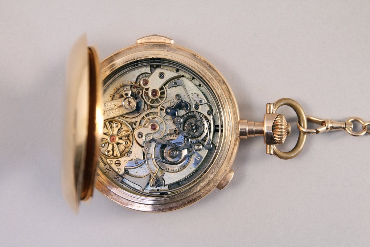 TEMPORA. CHRONOGRAPHE SAVONETTE à sonnerie en or jaune à remontoir au pendant. Cadran émaillé blanc indiquant les heures en chiffres arabes. Le boîtier monogrammé "GK". Cache-poussière signé et numéroté 337366.