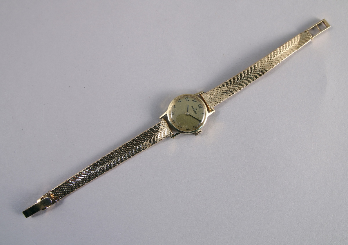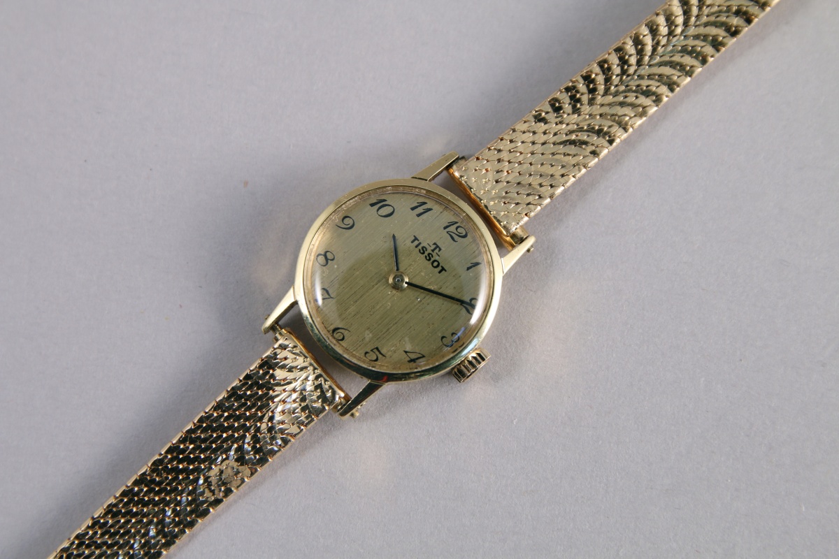 TISSOT. MONTRE BRACELET de DAME en or jaune 18K. Le boitier de forme circulaire marché Tissot avec les heurs en chiffres arabes. Remontoir à trois heures. Bracelet souple en or jaune 18K.