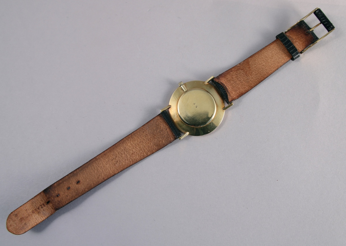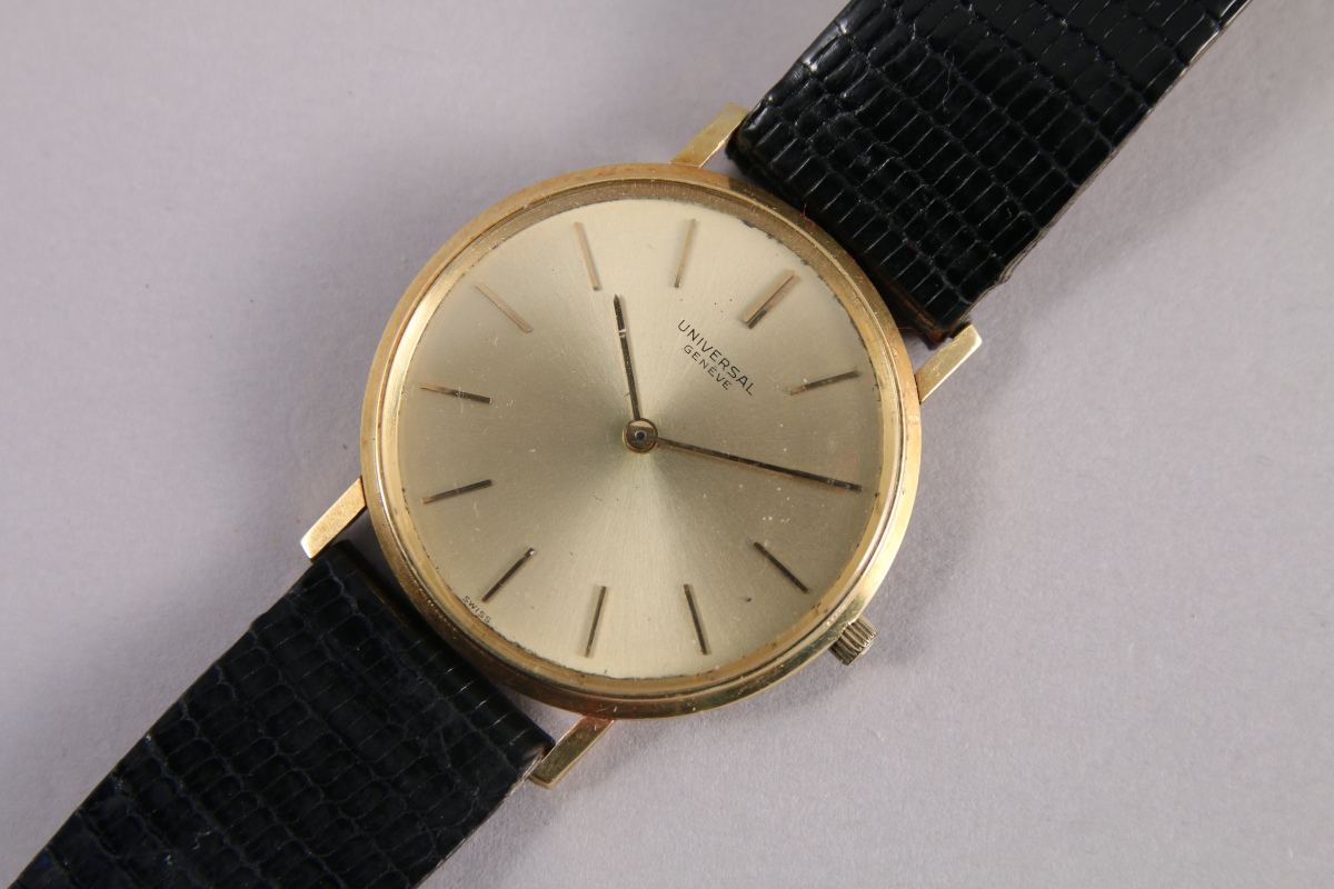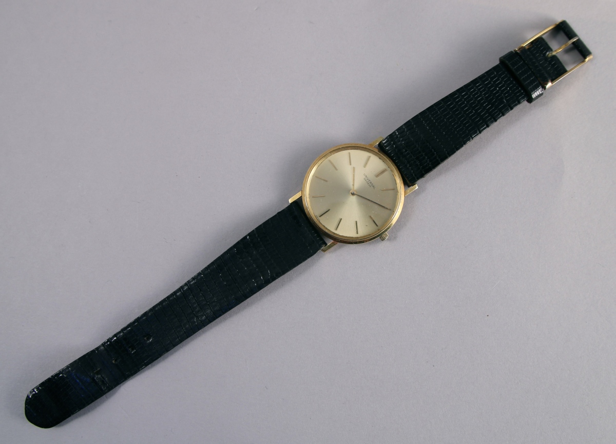 UNIVERSAL GÉNÉVE. MONTRE BRACELET de DAME en or jaune 18K. Le boitier de forme ronde, cadran doré, index bâtonnets pour les heures, bracelet en cuir noir écaillé.