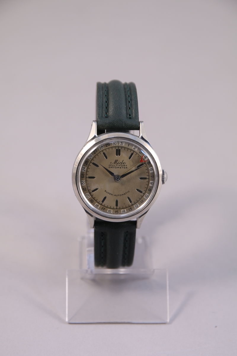 MIDO. Super Automatic. Montre bracelet en acier avec quantième. Boîtier rond avec fond vissé. Cadran patiné avec quantième date à chemin de fer. Mouvement automatique, rotor à butée.