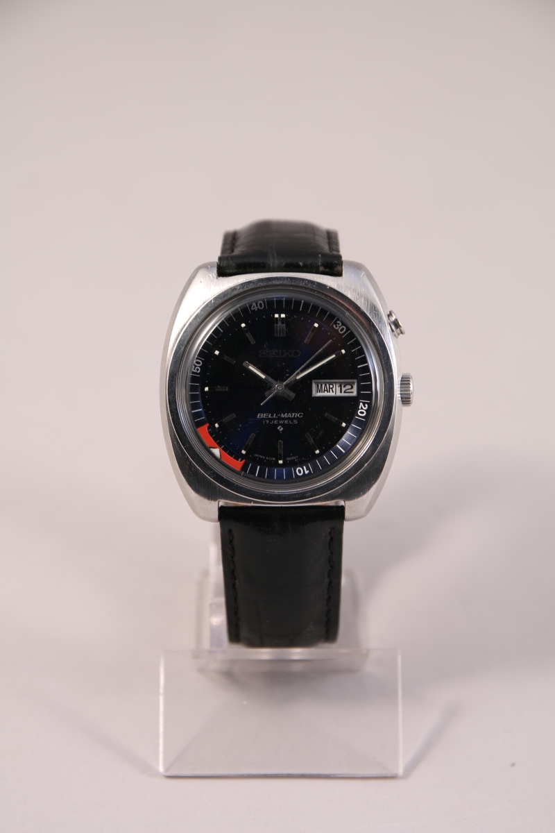 SEIKO. Bell-Matic. Montre bracelet en acier avec fonction réveil. Boîtier tonneau avec fond vissé. Cadran bleu avec double guichet jours et date. Mouvement Mécanique.