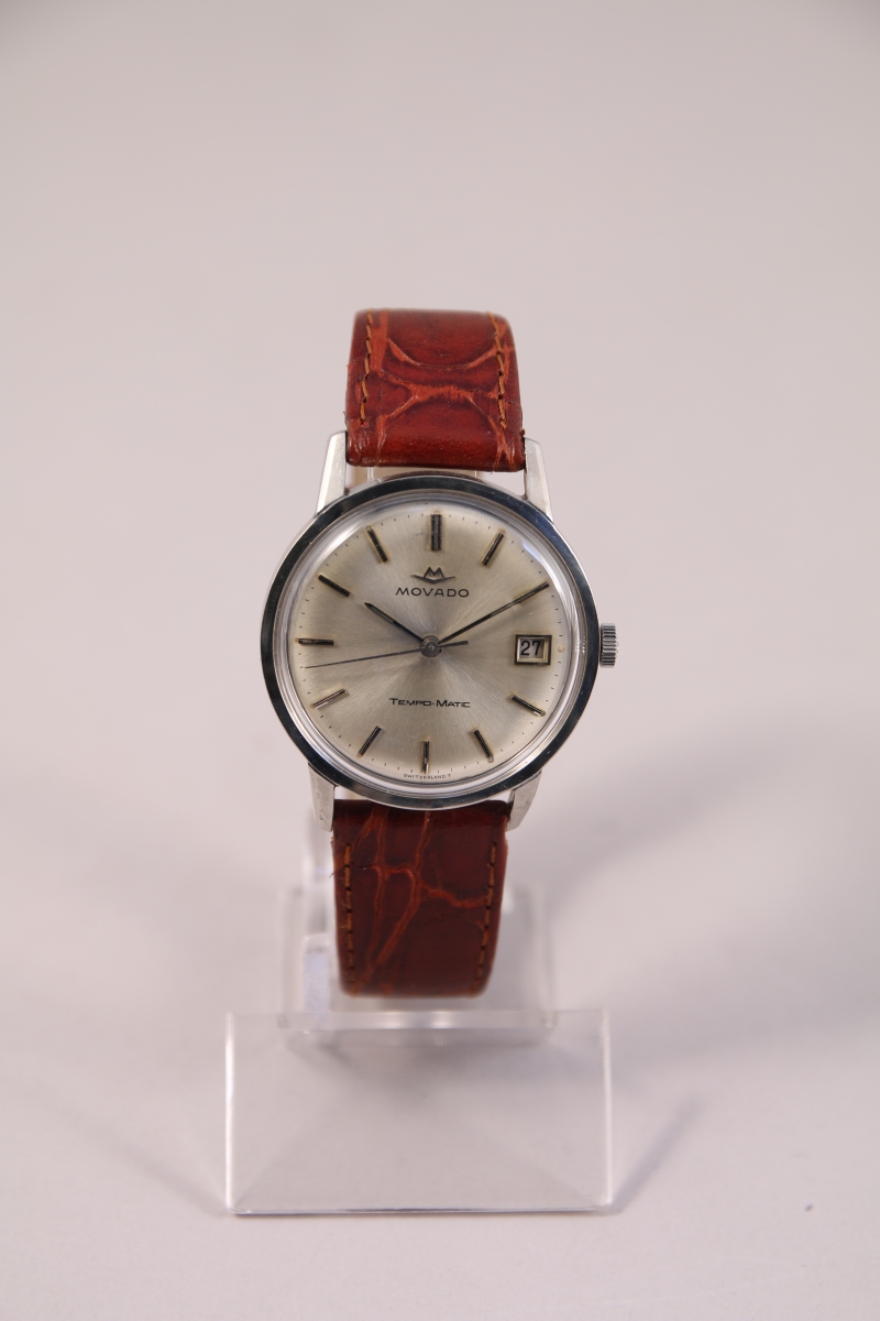 MOVADO. Tempo-Matic. Montre bracelet en acier. Boîtier rond avec fond vissé. Cadran patiné avec trotteuse centrale et date à guichet. Mouvement automatique.