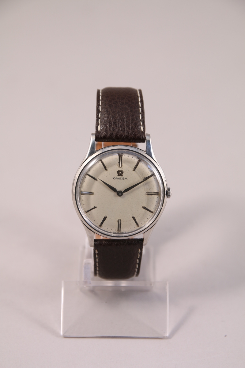 OMEGA. Montre bracelet en acier. Boîtier rond avec fond clippé. Cadran patiné avec index appliqués et chemin de fer. Mouvement mécanique.