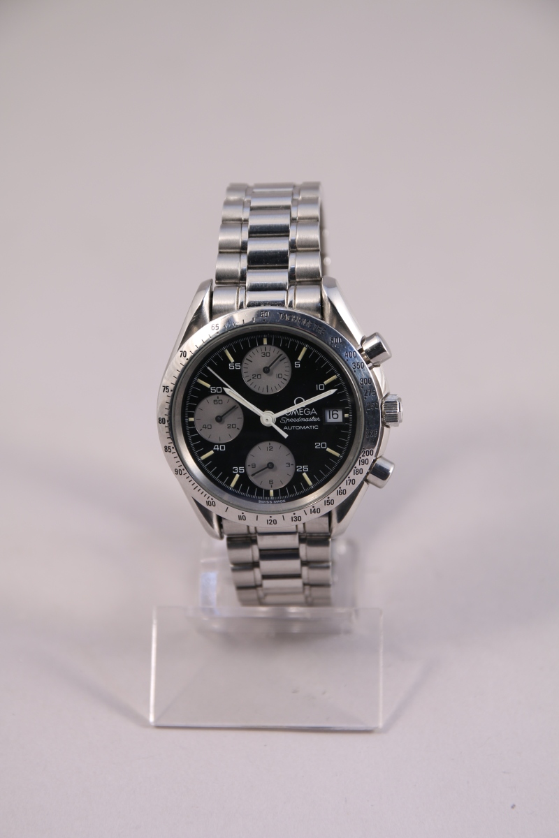 OMEGA. Speedmaster. Chronographe bracelet en acier. Boîtier rond avec fond vissé. Cadran noir avec trois compteurs et date à guichet. Bracelet en acier signé. Mouvement automatique.