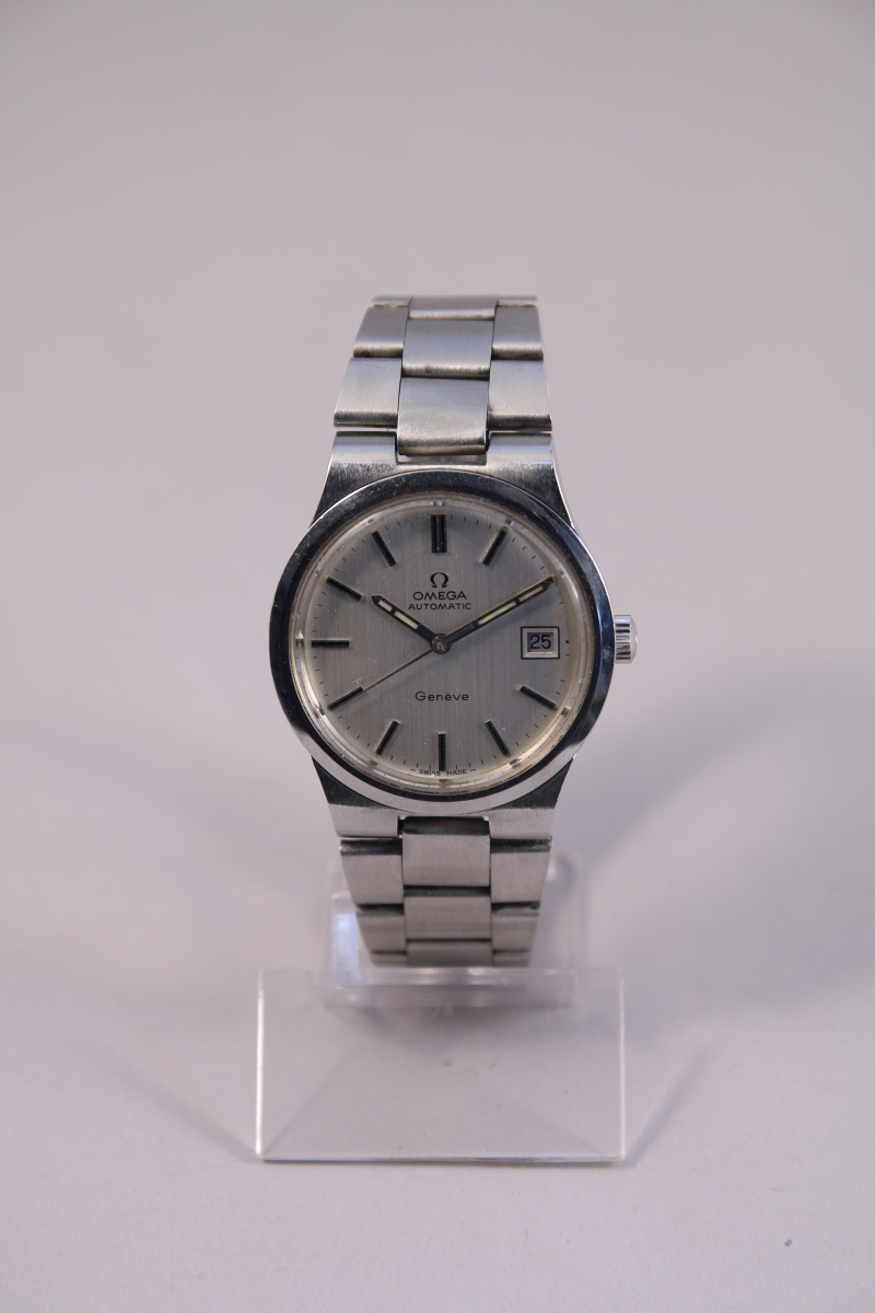 OMEGA. Automatic. Montre bracelet en acier. Boîtier rond avec fond vissé. Cadran argenté avec trotteuse centrale et date à guichet. Bracelet en acier signé. Mouvement automatique.