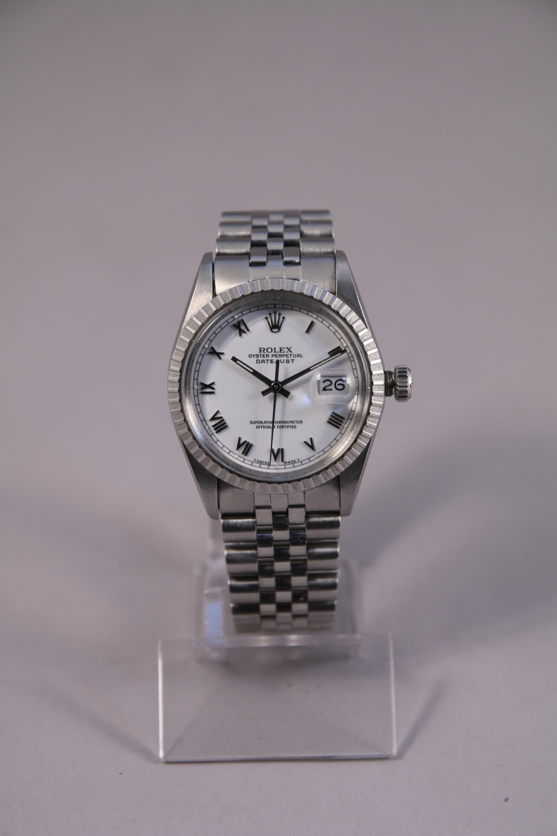 ROLEX. Datejust, Ref. 16030/16000, No. R587950. Montre bracelet en acier. Boîtier rond avec fond vissé. Cadran blanc avec trotteuse centrale et date à guichet. Bracelet en acier signé. Mouvement automatique, Cal. 3035.