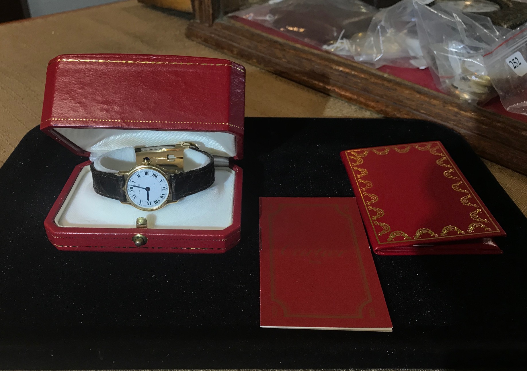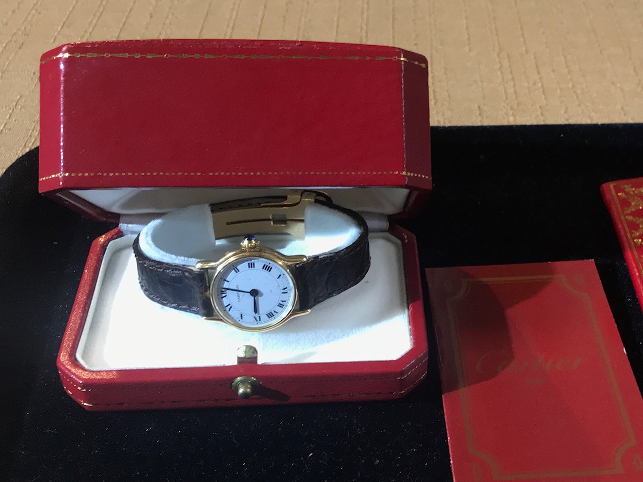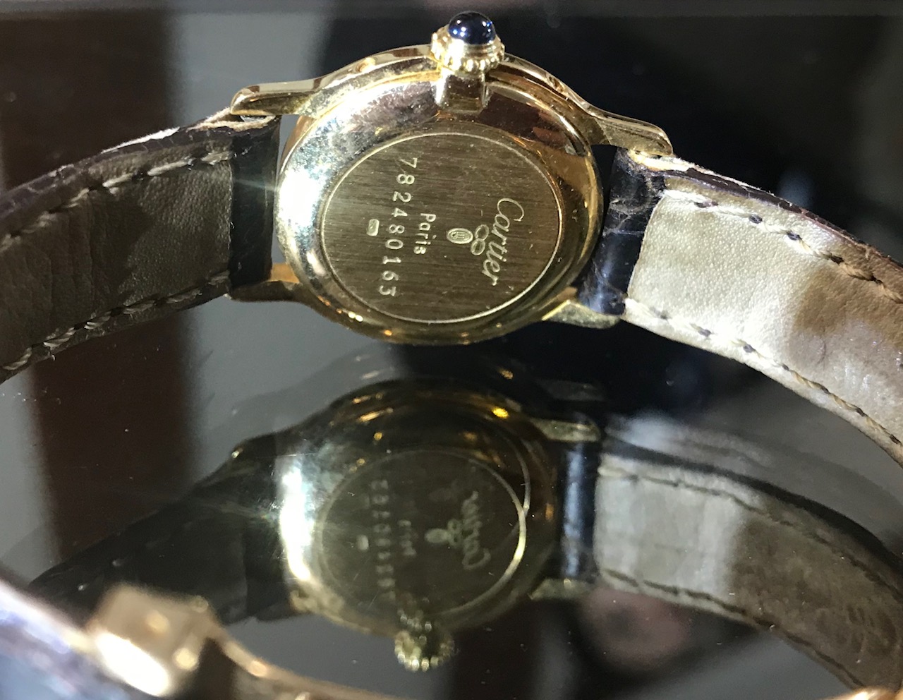 CARTIER. MONTRE " Le Must " de DAME en or jaune 18k de forme ronde. Cadran sigle, émaillé blanc, gradué pour les minutes avec les heures en chiffres romains, remontoir orné d'un saphir à trois heures. Boîtier numéroté 78240163 et gravé. Boucle ardillon en or jaune 18k et bracelet en cuir.