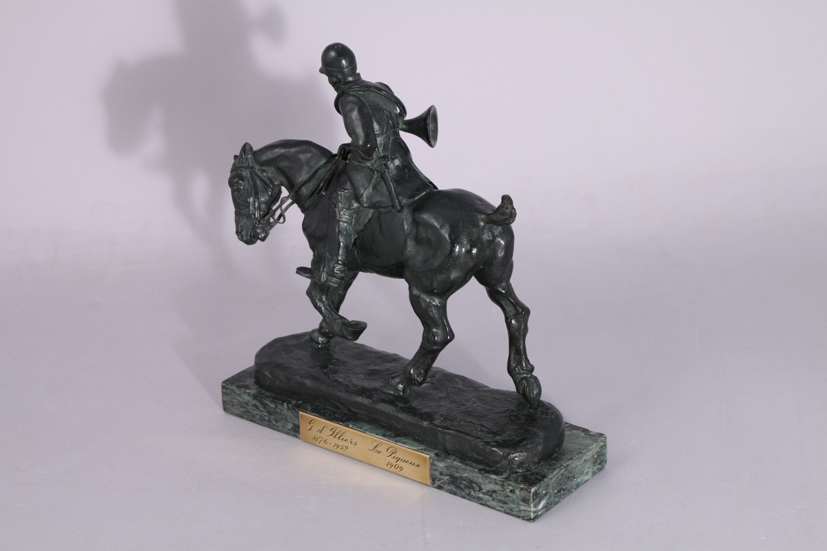 Socle en marbre vert et plaque dorée "G. d'Illiers, 1876-1852, Le Piqueux, 1909".