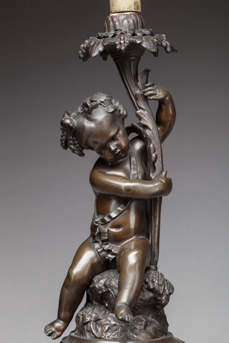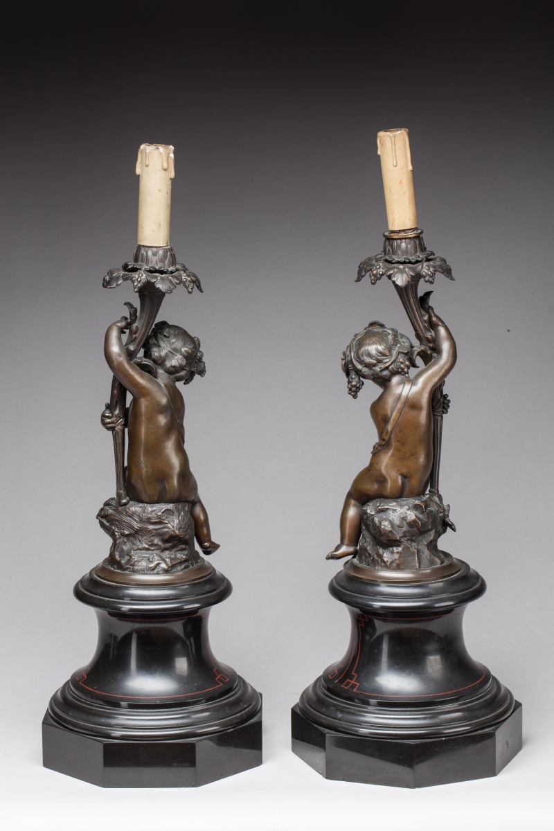 Paire de FLAMBEAUX l'ÉTÉ et l'AUTOMNE en bronze patiné figurant deux putti soutenant un bras de lumière chantourné à décor de cannelures, acanthes, feuilles de vigne et grappes de raisins. L'un, couronné de pampres de vigne, représente l'automne, l'autre coiffé de fleurs et gerbes de blé, l'été. Le binet adopte la forme d'une fleur de chrysanthème. Le piédouche en marbre noir à décor de filets en scagliole rouge est agrémenté d'un mascaron en bronze. Base octogonale.