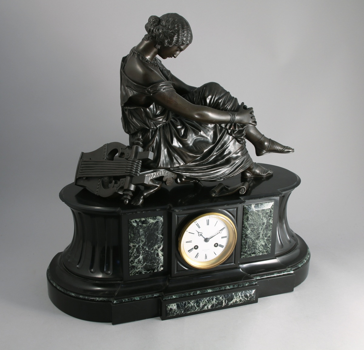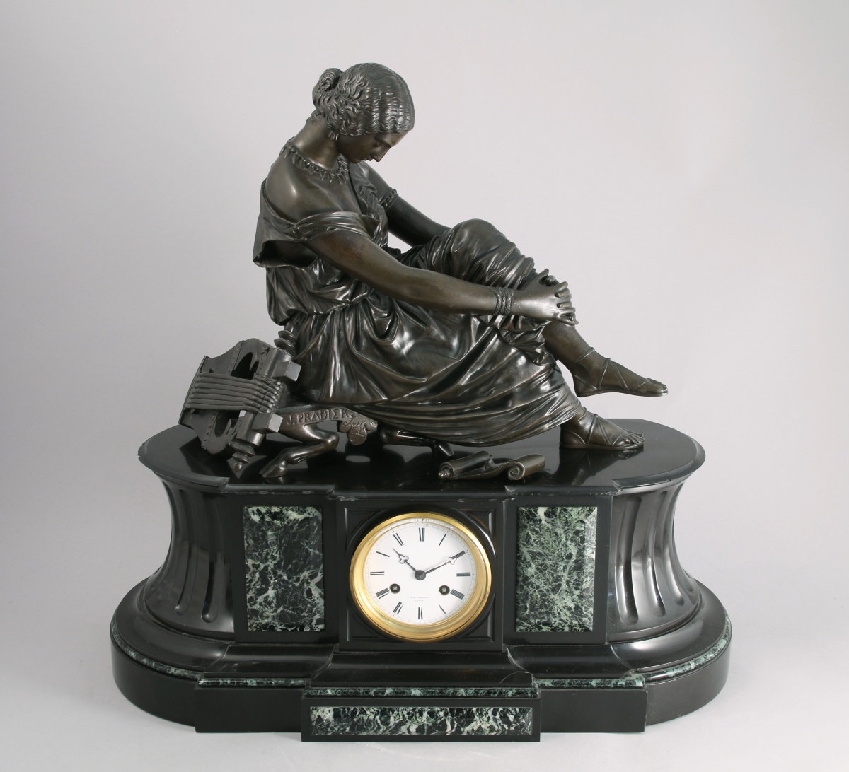 Le mouvement de la pendule s'inscrit dans un socle oblong en marbre noir et vert de mer supportant la figure en bronze de la poétesse Sappho. Cadran émaillé blanc signé Raingo Frères Paris. Les candélabres figurent deux jeunes femmes drapées à l'antique portant 10 bras de lumière. Elle repose sur un socle cannelé en marbre noir et vert de mer.