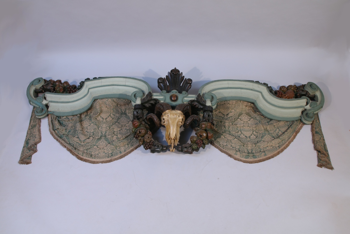 CORNICHE D'UN THÉÂTRE de forme mouvementée en bois mouluré et richement sculpté. Traverse à enroulements rechampie vert d'eau et bleu-vert centrée d'un aegicrane (crâne de bélier décharné) flanqué de guirlandes de fruits polychromes. Une large feuille d'acanthe à l'amortissement. Guirlandes de fruits que l'on retrouve à chaque extrémité de l'élément. Au-dessus du crâne figure un ovale peint d'armoiries (de gueules à la croix d'or cantonnée de quatre fleurs de lys de même) timbrées d'une couronne murale.