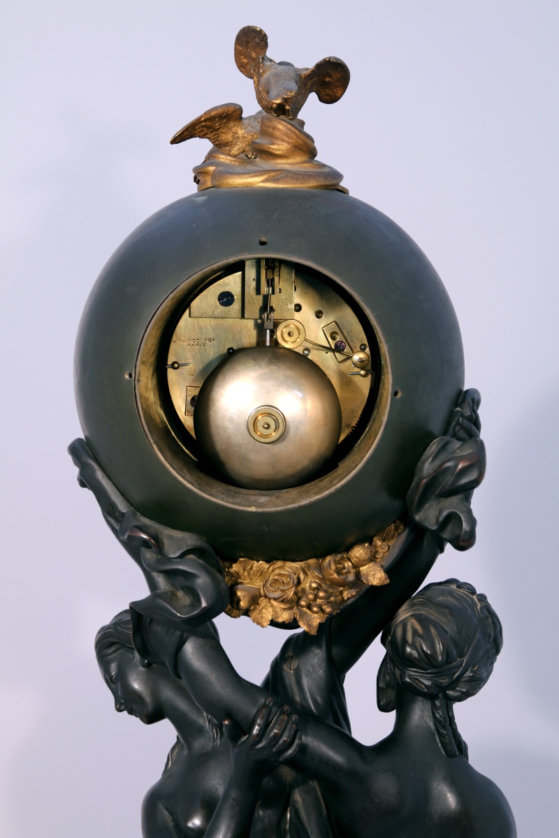 Bronze patiné, figurant deux jeunes femmes drapées soutenant un globe qui recèle le mouvement. L'une d'elle retient une guirlande de fleurs. Elle reçoit deux colombes amoureuses en bronze doré à l'amortissement. Base circulaire en marbre blanc ornée d'une frise feuillagée en bronze ciselé et doré. Mouvement à plaque signé. Aiguilles en forme de serpent décorées de strass.