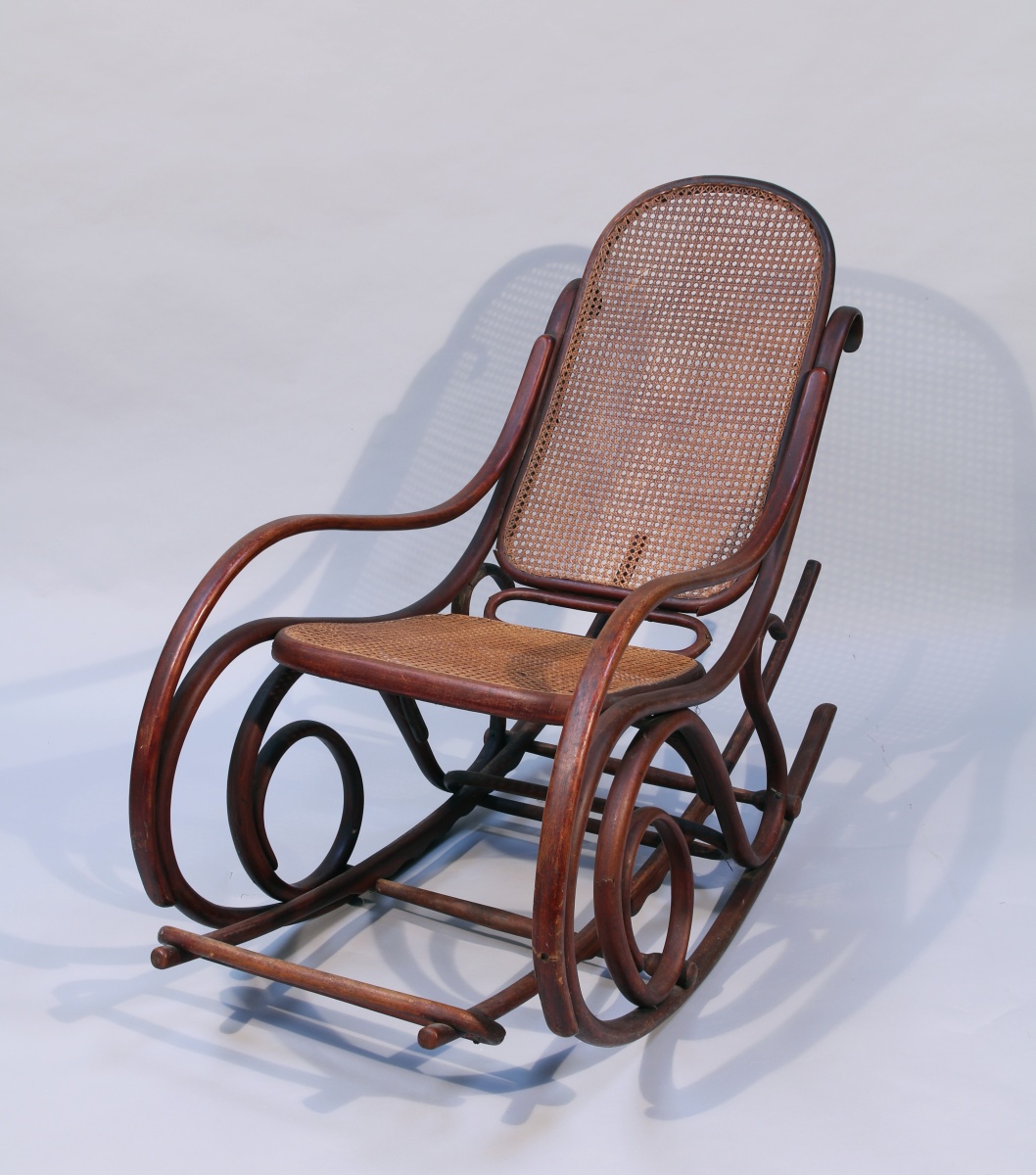 THONET. Rocking Chair en bois thermoformé à patine foncée avec repose pied amovible. La forme du fauteuil en courbes et volutes, le dossier et l'assise cannés.