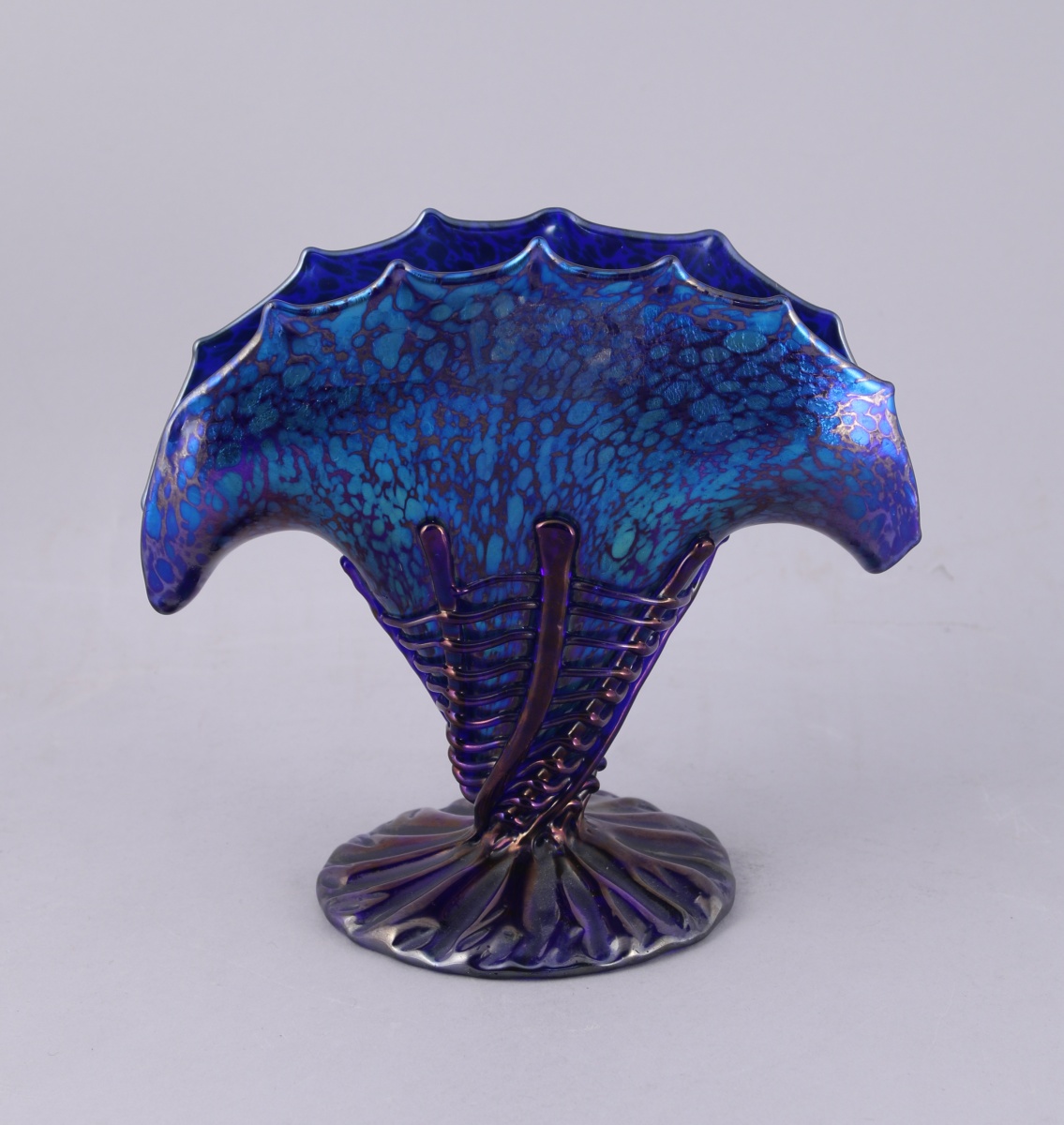 LOETZ, VASE cornet de forme éventail, en verre bleu iridescent, au col de forme lancéolée. Application de verre en motif de tressage sur la panse.