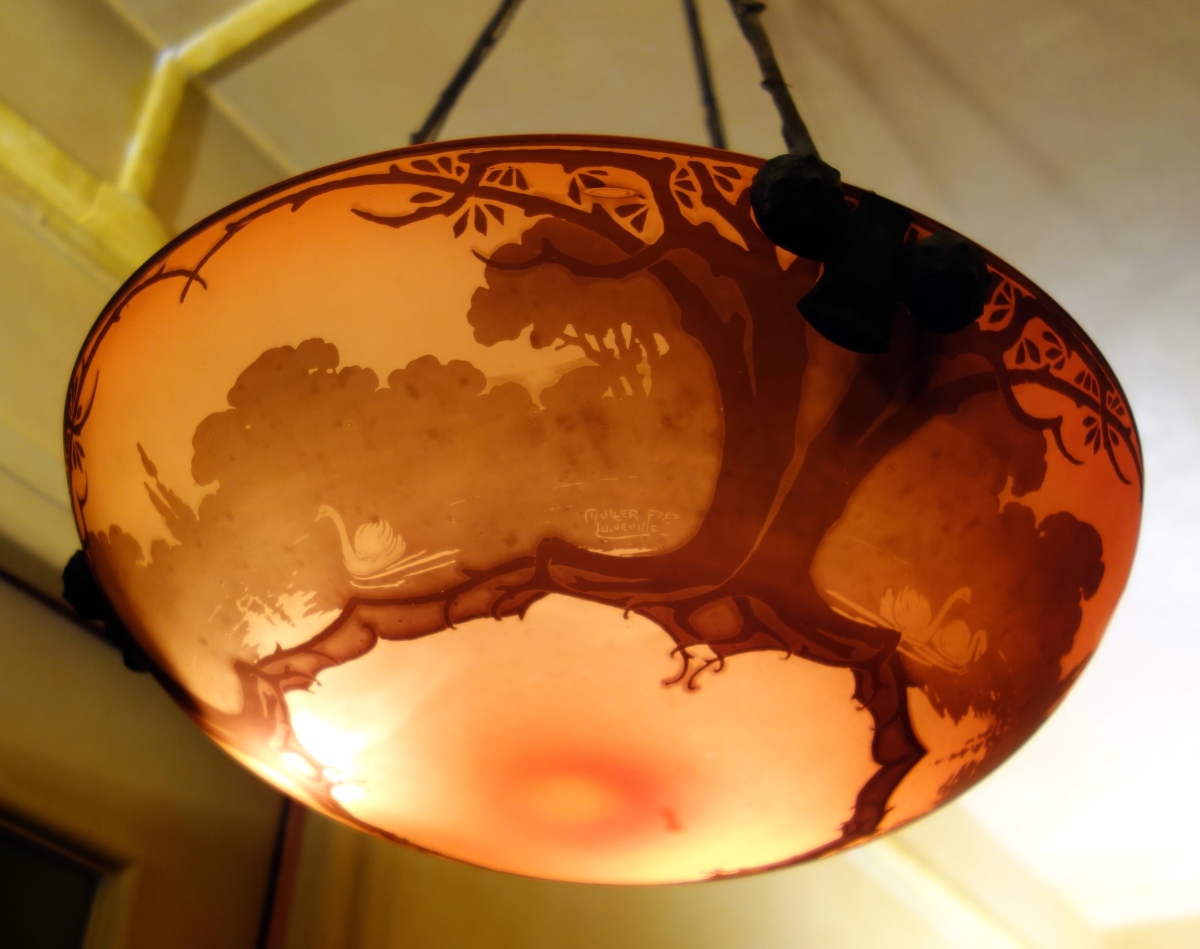 MULLER FRÈRES. SUSPENSION en pâte de verre multicouche dégagé à l'acide, de cygnes se baignant en trois cartouches.