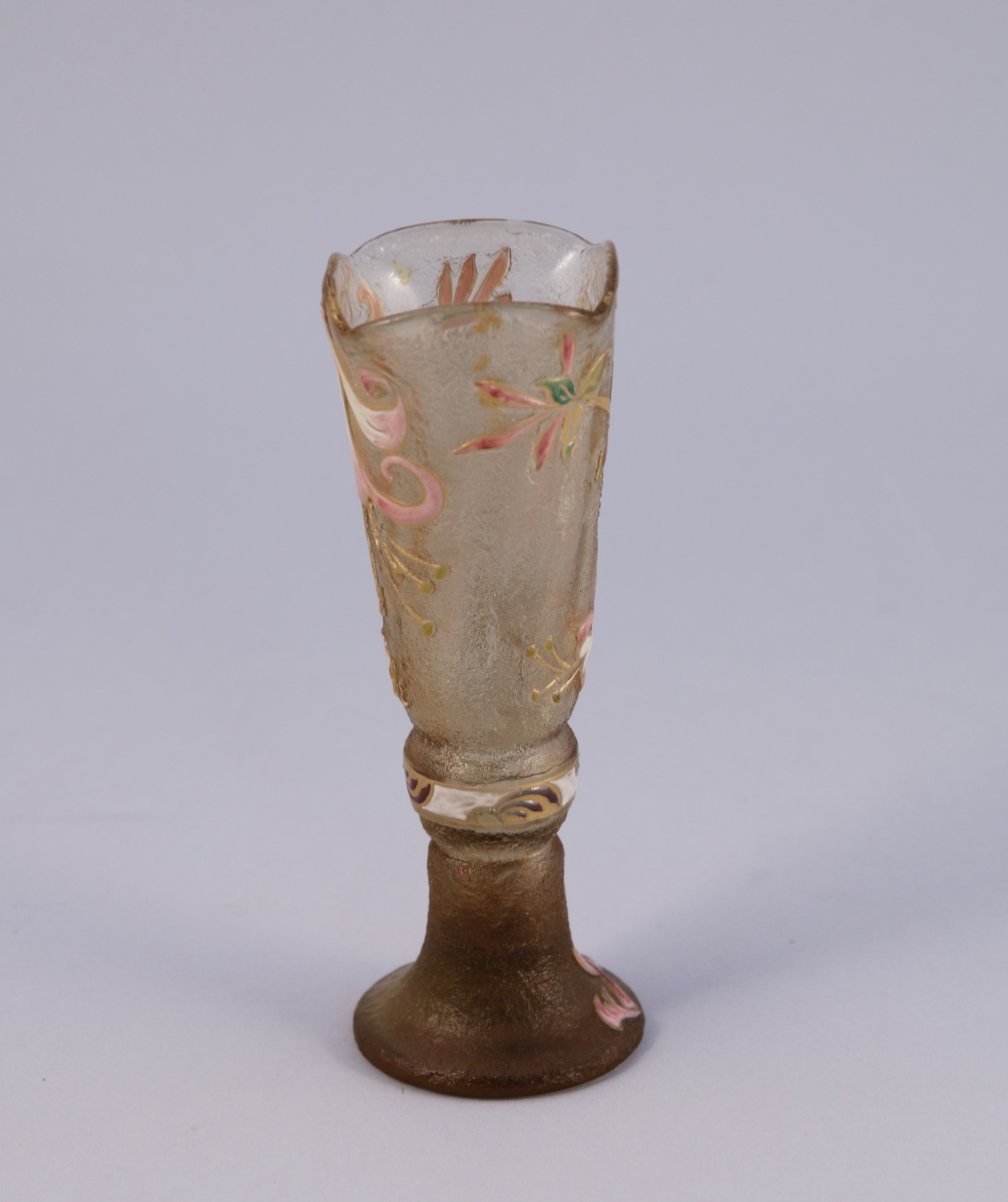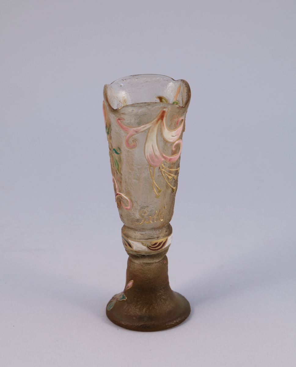 GALLÉ. VASE cornet en verre translucide fumé. Décor en relief dégagé à l'acide de fleurs de chèvrefeuille émaillées polychrome et or sur fond granité. Il repose sur un piédouche. Signé.
