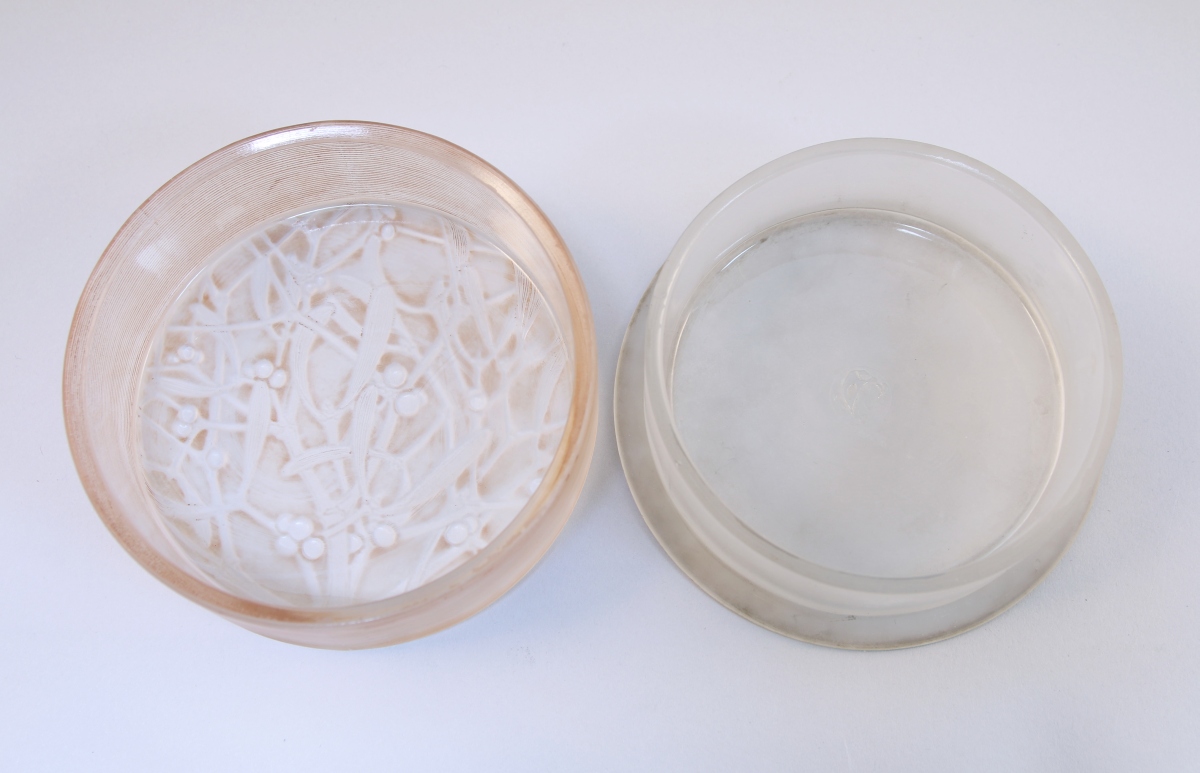 LALIQUE (1860-1945). BOÎTE À POUDRE de forme ronde, modèle "Gui", en verre incolore pressé et moulé. Le couvercle légèrement bombé à décor de rameaux de gui entrelacés. Signée " R.Lalique" et marque au masque des verreries d'Alsace. Modèle créé en 1920.