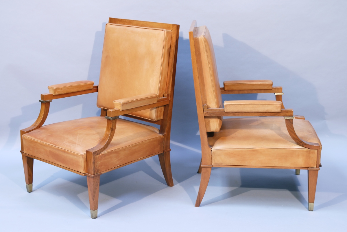 en noyer, accotoirs avec appliques de bronze, recouvert d'un cuir Hermès gold.