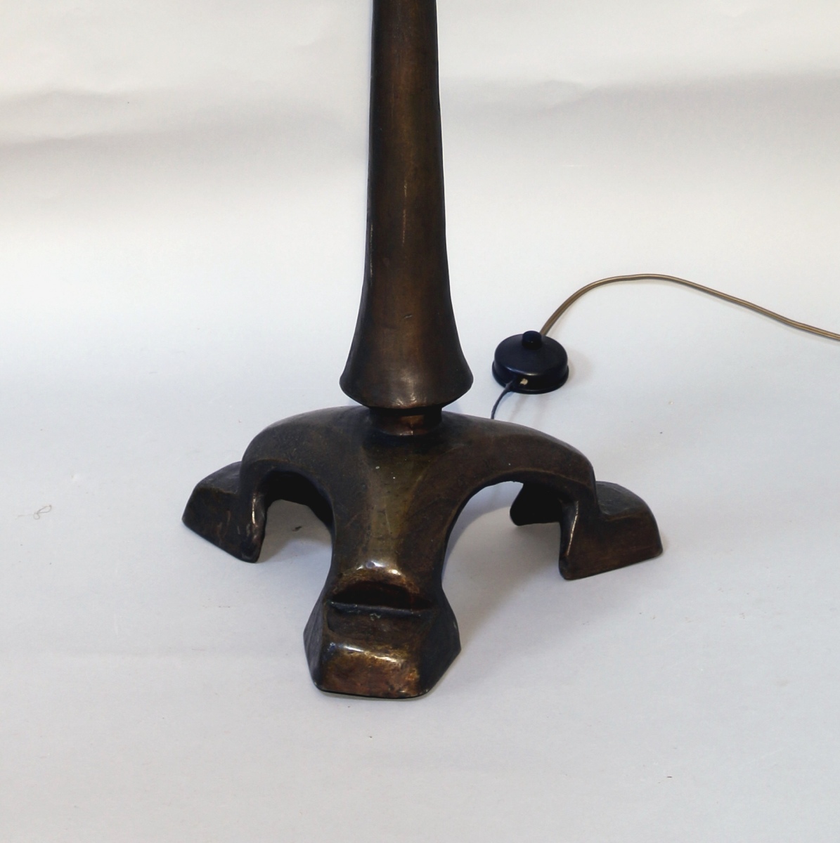 LAMPE de PARQUET en bronze patiné. Le fût fuselé est terminé par un disque soulignant une coupe tronconique; il repose sur trois pieds cambrés.