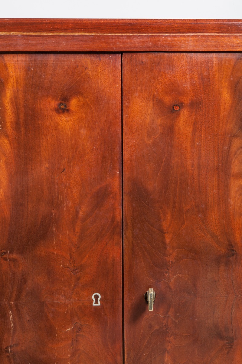 COMMODE de forme rectangulaire en placage d'acajou flammé. Elle ouvre en façade par deux vantaux découvrant deux étagères. Les montants antérieurs détachés à pans coupés. Elle repose sur quatre pieds sabre en gaine.