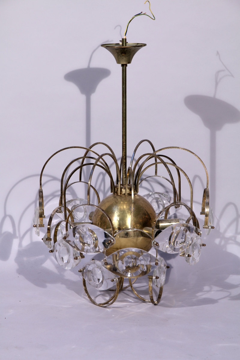 SUSPENSION BOULE en métal doré à 15 branches ornée chacune d'une lentille oeil en verre optique. 9 lumières. Étiquette "Stilkronen made in Italy".