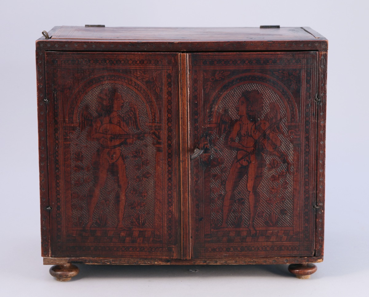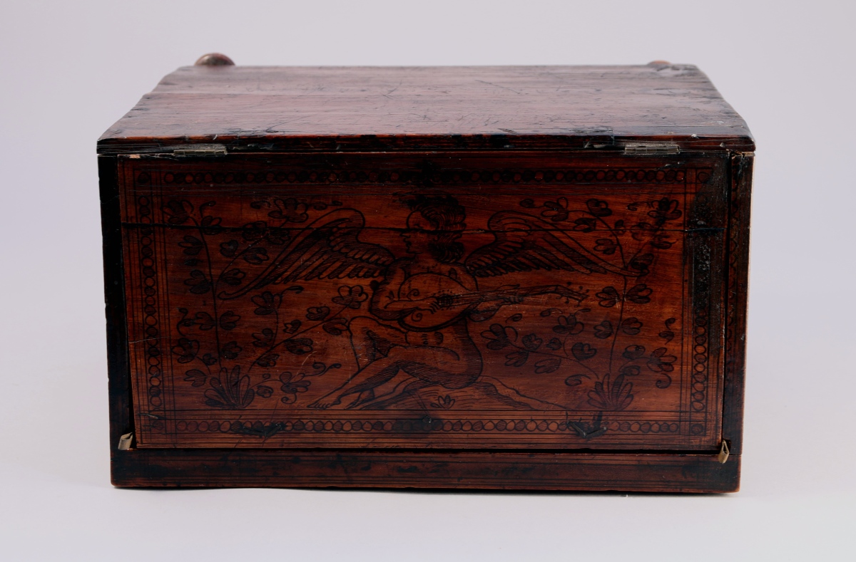 de forme rectangulaire en bois naturel. Il ouvre en façade par deux vantaux découvrant un intérieur architecturé à sept tiroirs et une niche recelant deux tiroirs secrets. Boutons de tirage en ivoire. Un coffre compartimenté en partie supérieure se découvre sous le couvercle à charnières. Décor à l'encre d'anges musiciens, lion, motifs géométriques et floraux.