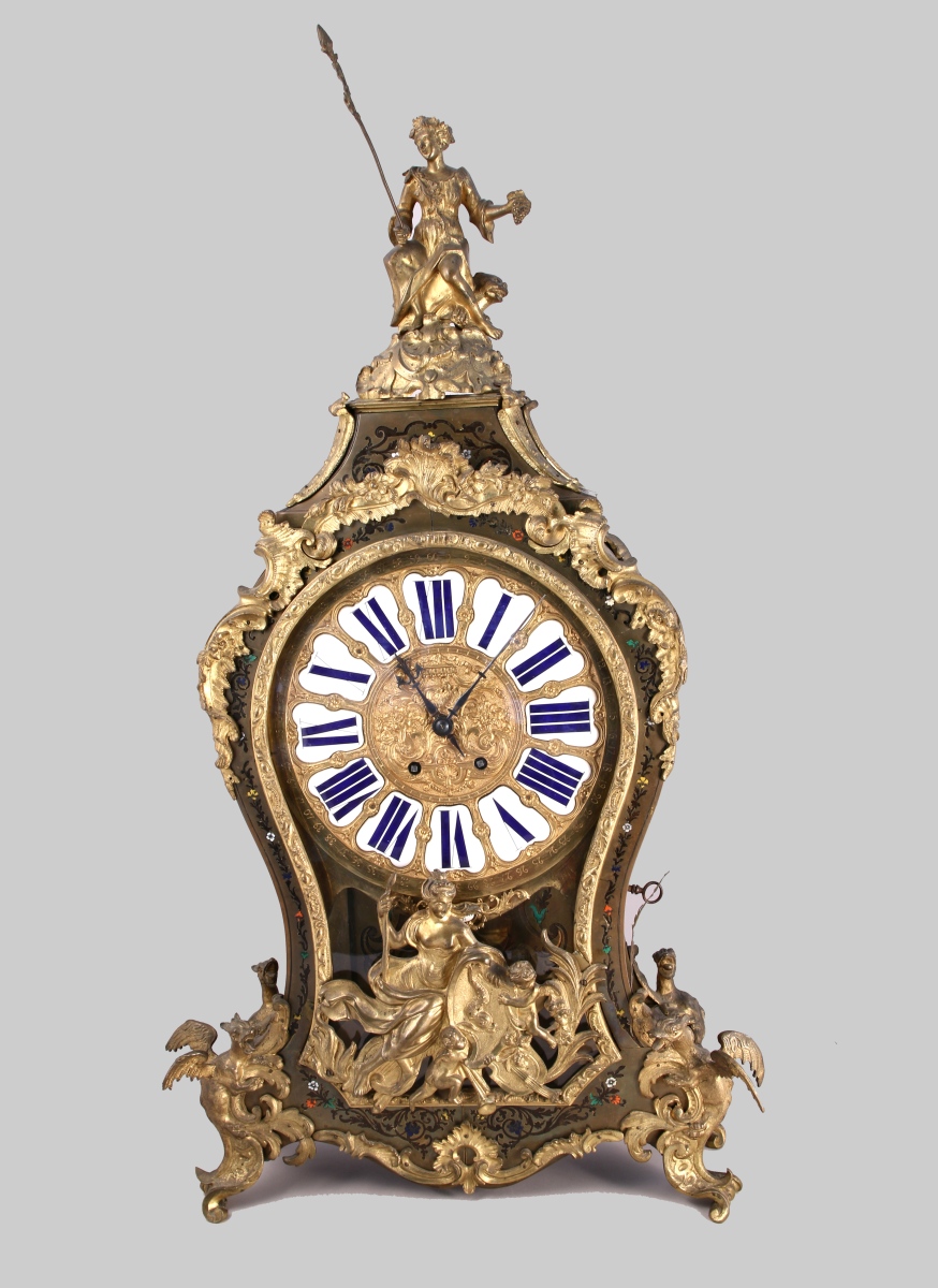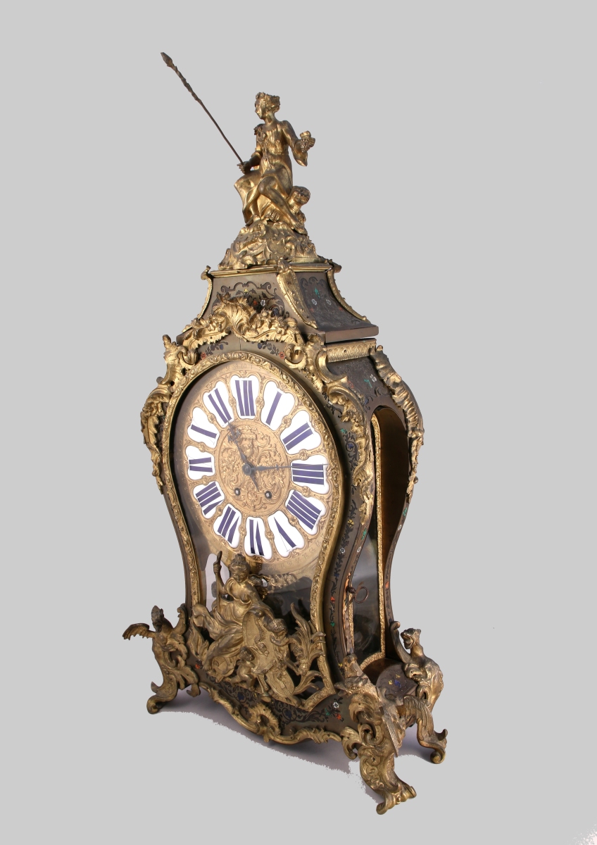 en contrepartie de laiton, et à la façon de l'écaille, nacre et corne teintée jaune, bleu, orange et vert orné de rinceaux et guirlandes de fleurs. Le cadran en bronze doré à cartouches émaillés reçoit un décor à la Bérain centré d'un coq. Riche ornementation de bronzes ciselés et dorés : ornements rocailles, feuilles d'acanthe, agrafes et coquilles. Une bacchante assise sur une panthère et tenant une thyrse surmonte l'ensemble tandis que la plaque de la porte représente une renommée aux putti présentant un écu au dauphin. Des dragons grimaçants cantonnent le piètement quadripose à enroulements. Intérieur marqueté d'un damier de laiton. Le cadran signé dans un cartouche émaillé "BALTHAZAR À PARIS".