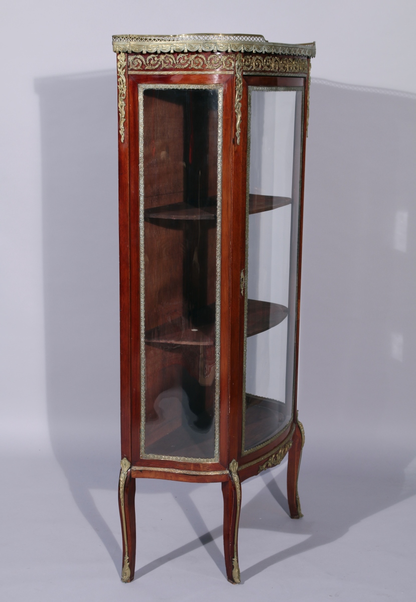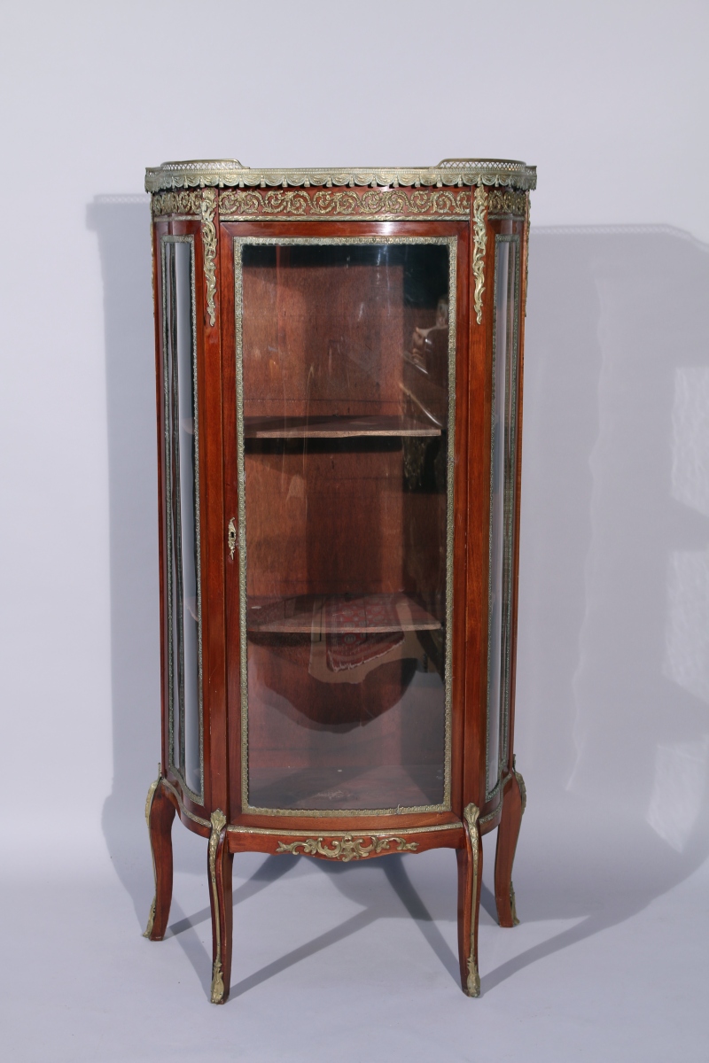 ouvrant en façade par une porte vitrée bombée. Les côtés évasés également vitrés. Elle est coiffée d'un marbre rouge veiné blanc ceint d'une galerie de laiton ajourée agrémentée d'une frise drapée. Elle repose sur quatre pieds cambrés. Riche ornementation de bronzes ciselés et dorés tels que frise de rinceaux ajourée, chutes, baguettes, culots et sabots feuillagés.
