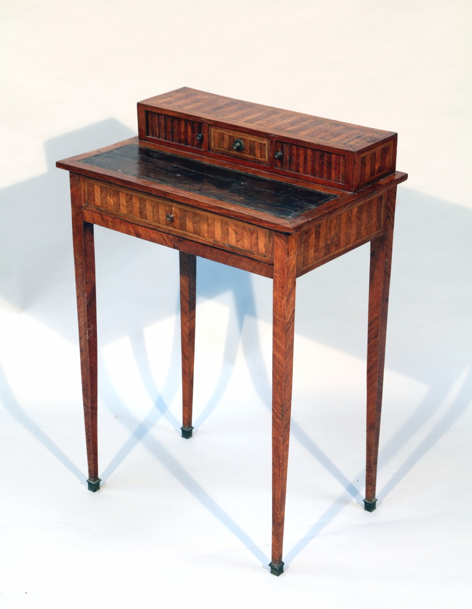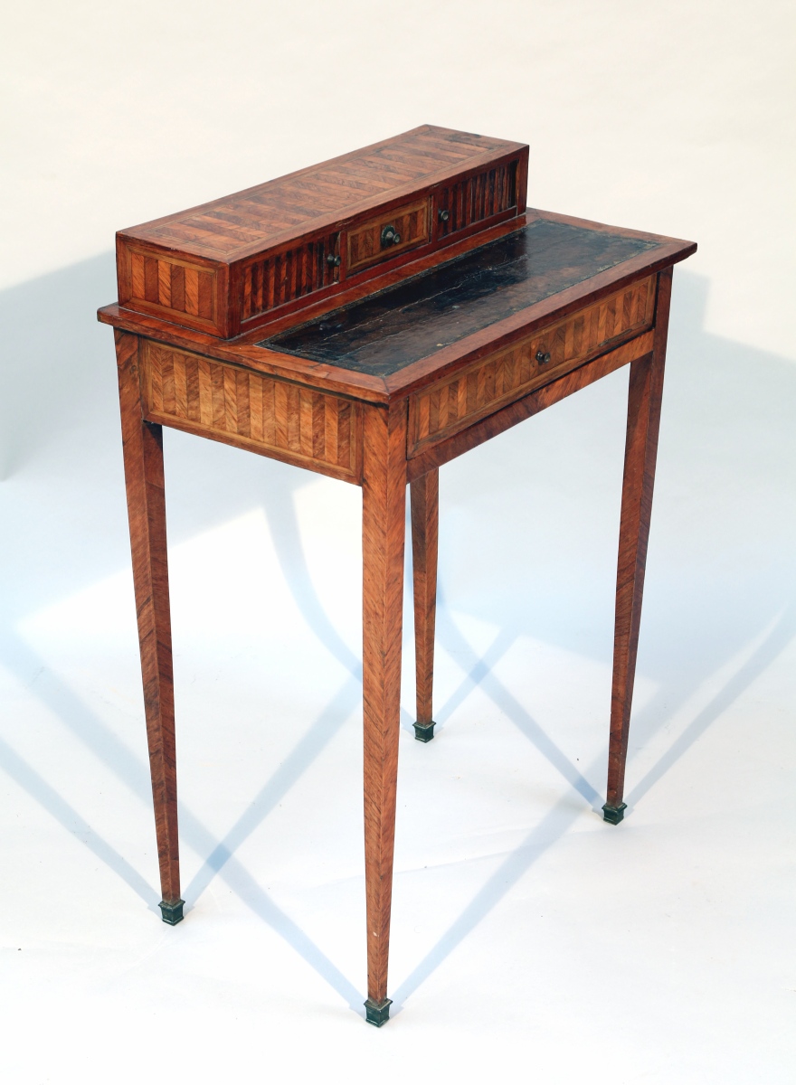 de forme rectangulaire en placage de bois marqueté en chevrons toutes faces. Il ouvre en ceinture par un tiroir et par un tiroir flanqué de deux volets à lattes dans le gradin. Pupitre gaîné de cuir à frise dorée aux petits fers. Garniture de bronzes dorés tels que boutons de tirage et sabots. Il repose sur quatre pieds gaine.
