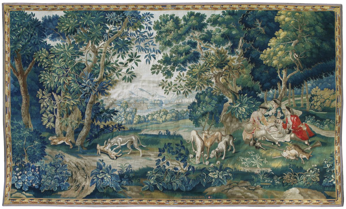 Cette grande, pittoresque et fine tapisserie est à décor d'une clairière. À droite de la composition, un groupe de trois chasseurs, dont l'un porte un vêtement rouge vif, partagent une collation, après une chasse au lièvre. On aperçoit à côté d'eux des fusils et un lièvre, ce qui livre un tableau de chasse assez restreint... Mais la journée n'est pas finie. À leur gauche, trois chiens semblent également se restaurer tandis qu'un quatrième attrape dans sa gueule un gibier et qu'un autre lièvre décampe vers la gauche de la composition.