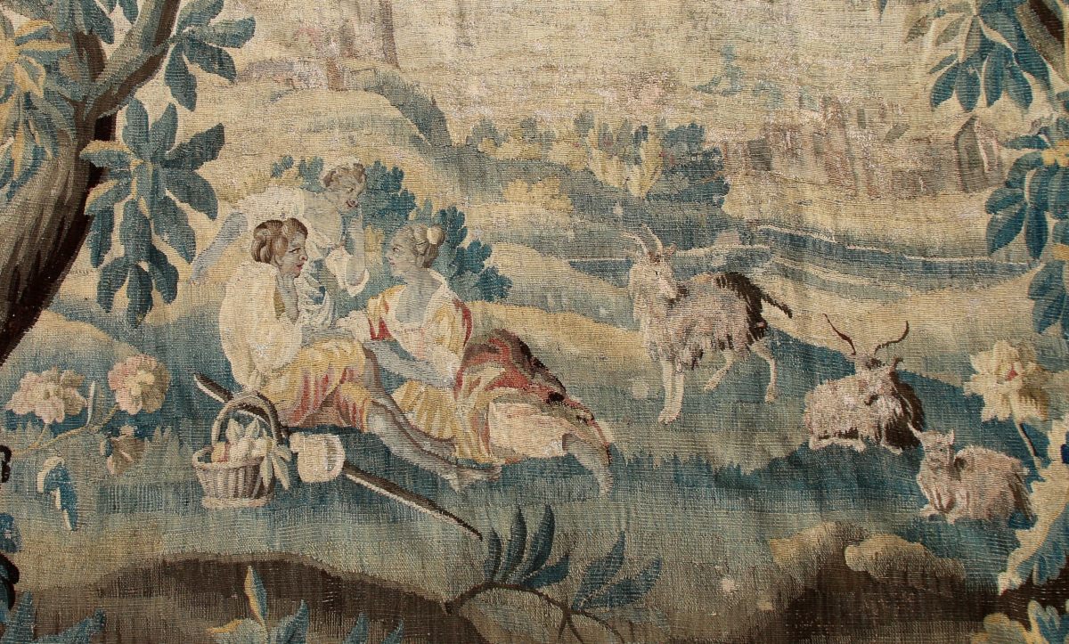 Tapisserie en laine et soie avec une pastorale, d'après Jean Baptiste HUET (1745-1811), berger et bergères gardant un troupeau, bordure à fond rouge, décor de rinceaux.