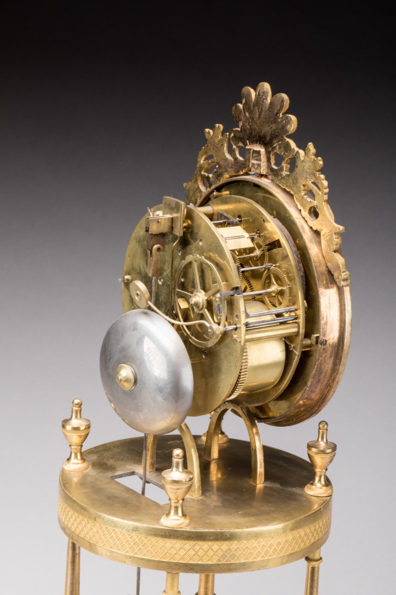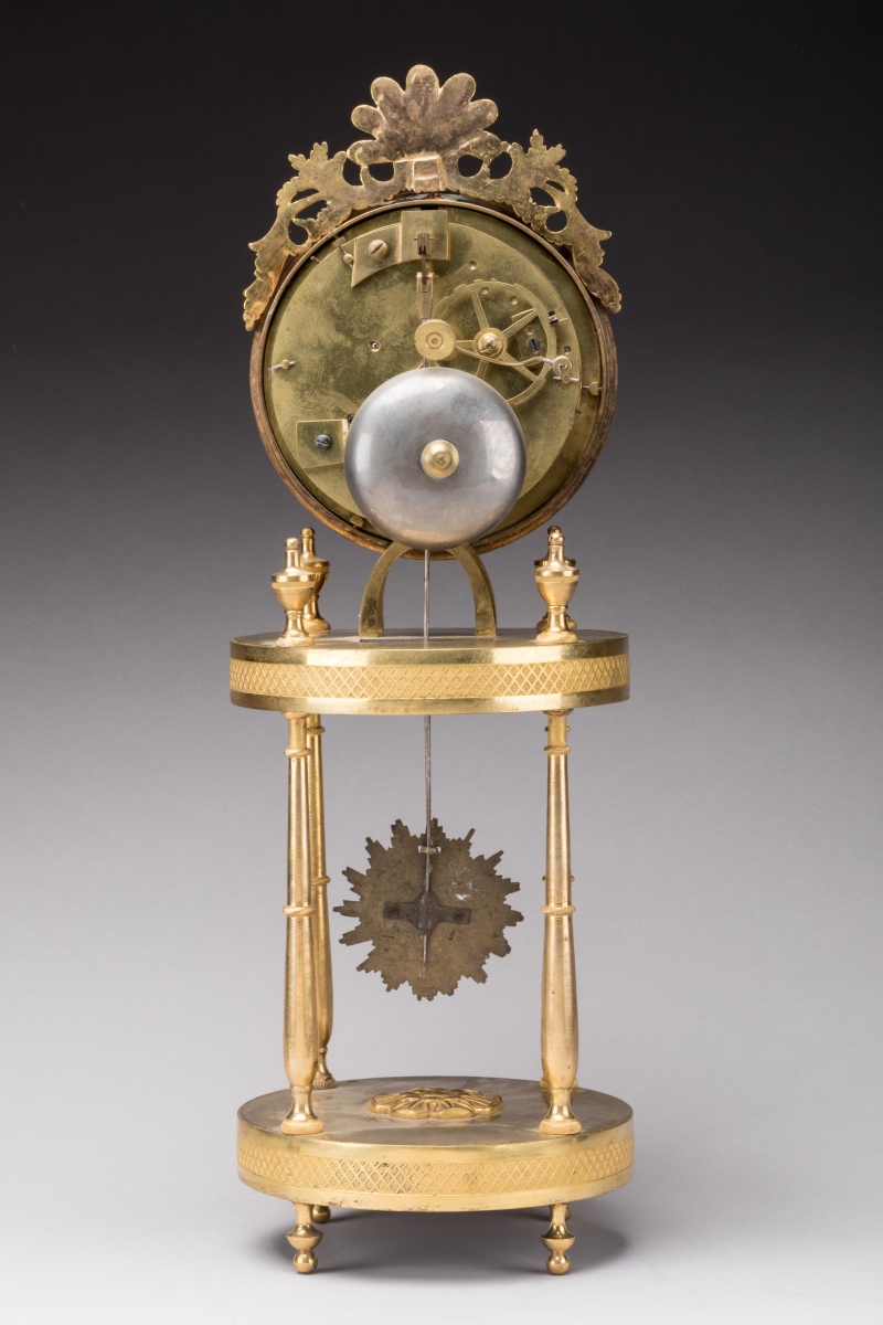 Le cadran de forme circulaire à disque émaillé blanc indiquant les heures en chiffres romains. Il est cerclé de laiton orné de frises de lauriers, d'oves et de feuilles d'eau et est sommé d'une palmette flanquée de rinceaux ajourés. Le mouvement repose sur une plateforme discoïdale agrémentée de quatre toupies et soutenue par quatre colonnes en balustre. Base discoïdale agrémentée d'un fleuron central et ciselée de quadrillages. Piètement toupie quadripode. Balancier à masque solaire rayonnant.