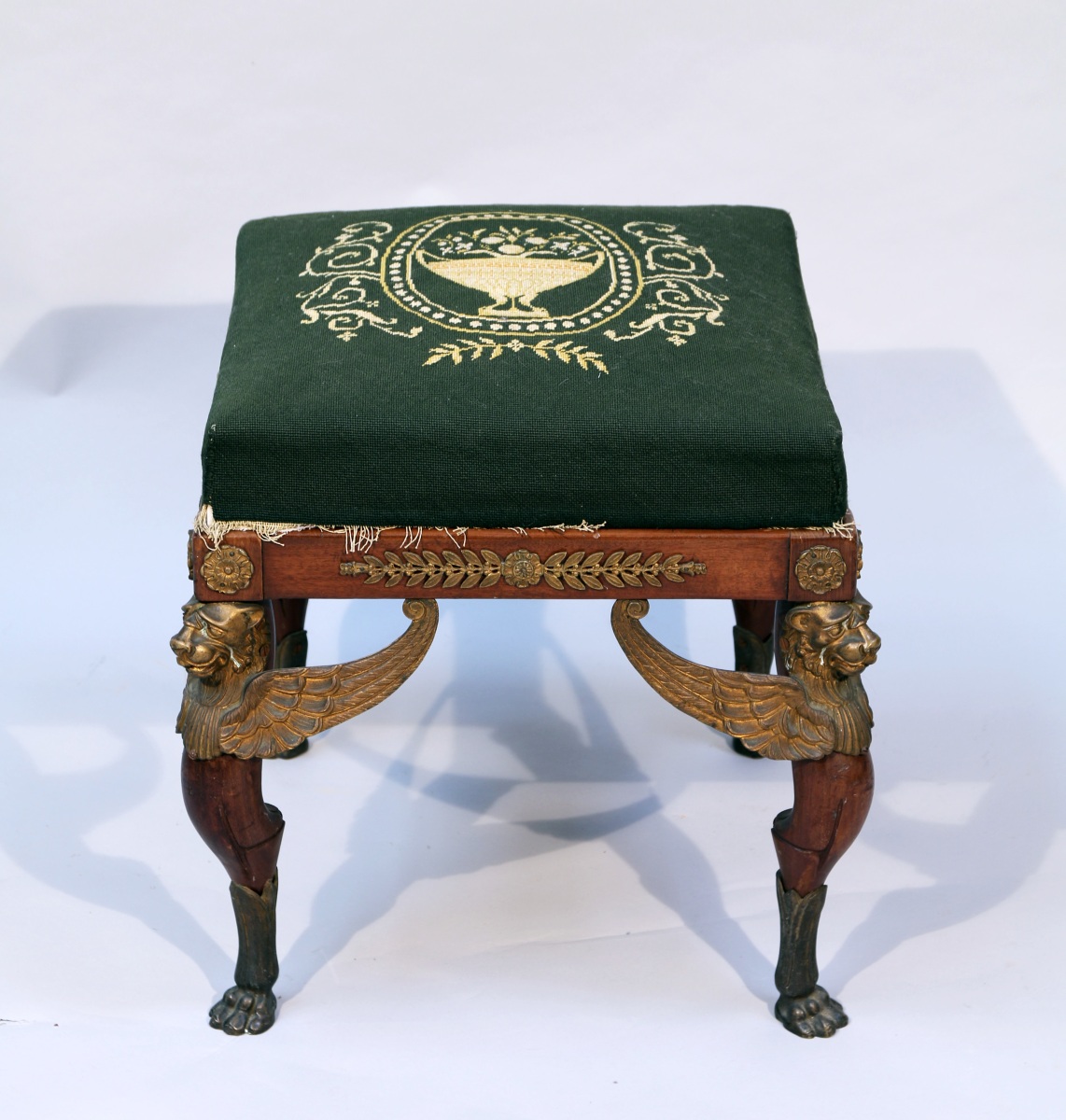 Inspiré du mobilier dit "Retour d'Égypte" dessiné par Percier et Fontaine et réalisé par la dynastie Jacob pour les palais du premier Empire, ce tabouret appartient à une petite série -peut-être un salon dispersé- dont ont été localisés deux autres exemplaires et une banquette sur le marché de l'art international (Embree & Lake Dallas, Osenat Fontainebleau, Leslie Hindman Chicago). La qualité des bronzes et la solidité de l'assemblage indique un travail parisien de qualité pour un amateur fortuné.