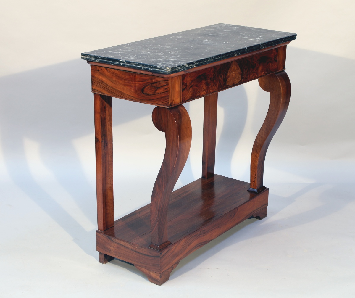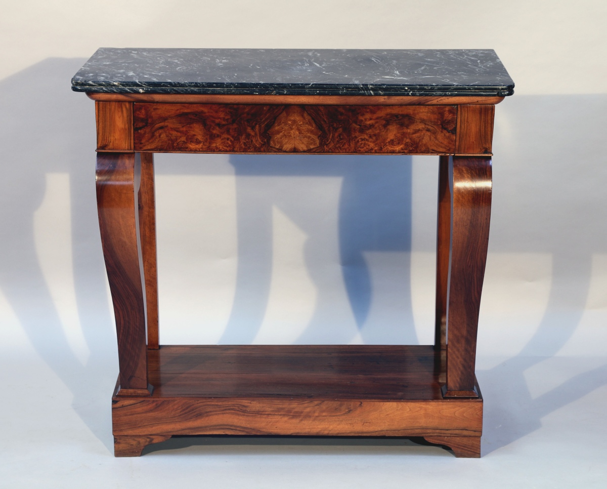 ouvrant à un tiroir en ceinture. Les montants antérieurs se terminent en volute et les montants postérieurs en pilastres droits. Dessus de marbre gris Sainte Anne.