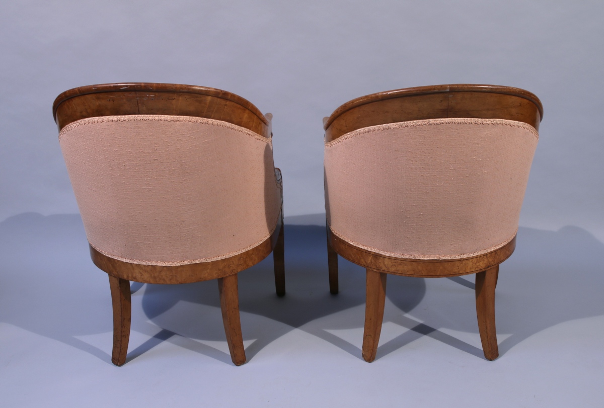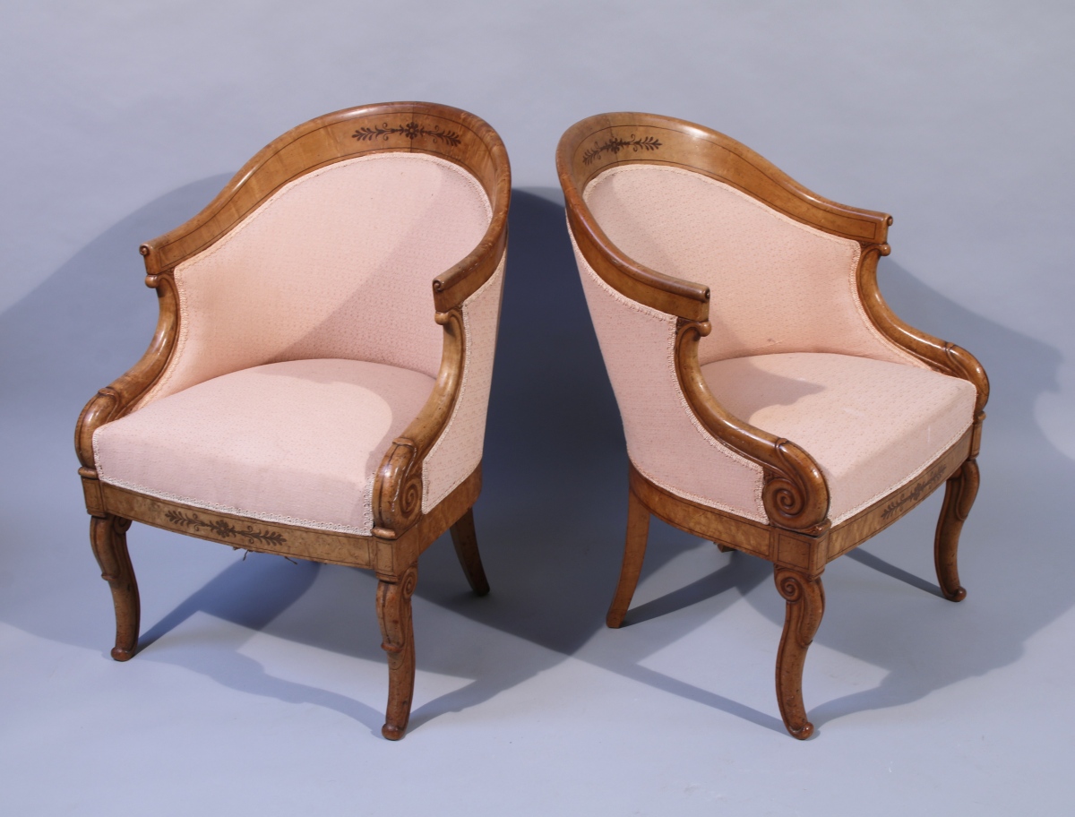 en placage de loupe d'orme et marqueterie de palissandre. Le dossier et la traverse ornés d'une fleur flanquée palmettes dans un encadrement de filet. Les consoles d'accotoirs en retrait, à enroulement. Les pieds antérieurs en jarret, les pieds postérieurs en gaine arqués.