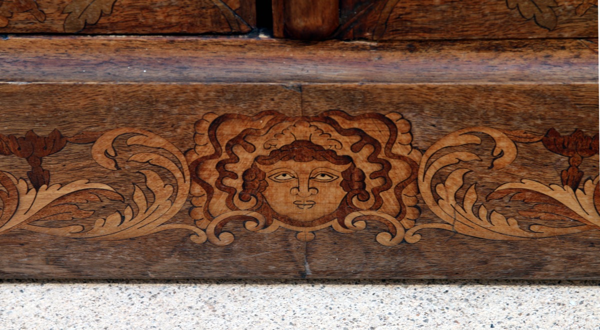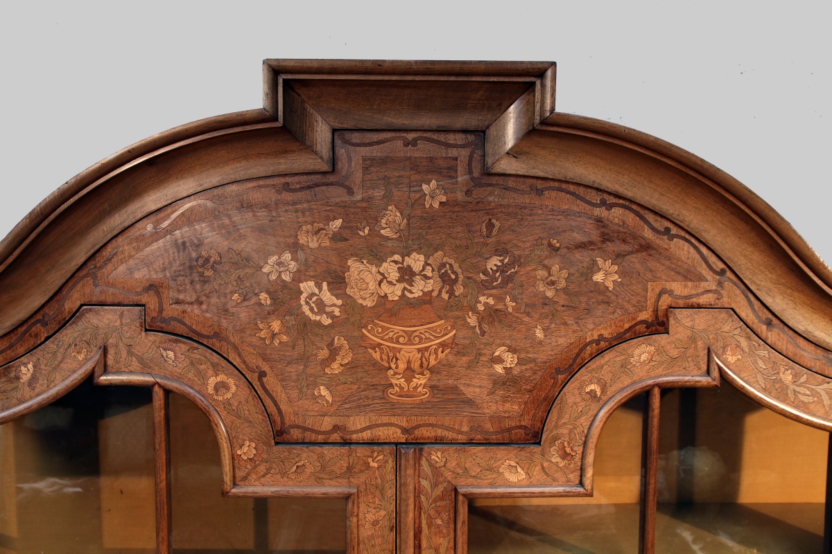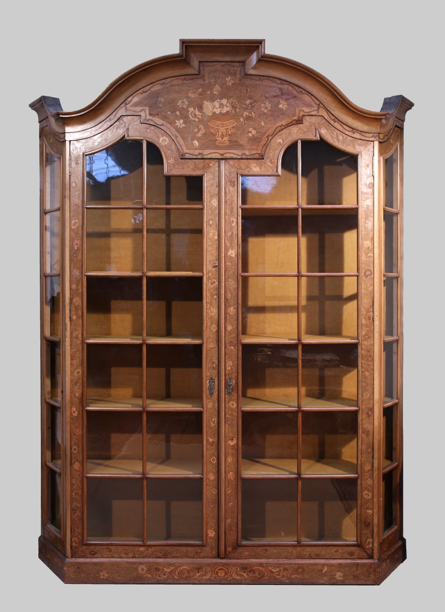 en bois de placage. L'armoire est à deux corps, munie de 2 portes vitrées à croisillons et présente 5 étagères à l'intérieur recouvert de tissu jaune. Elle est chapeautée d'un fronton en courbes et contre-courbes. Les faces latérales sont disposées en biais. La marqueterie présente en façade un décor de vase de fleurs, de rinceaux, de bouquets ainsi qu'un petit mascaron à coquille sur la plinthe.